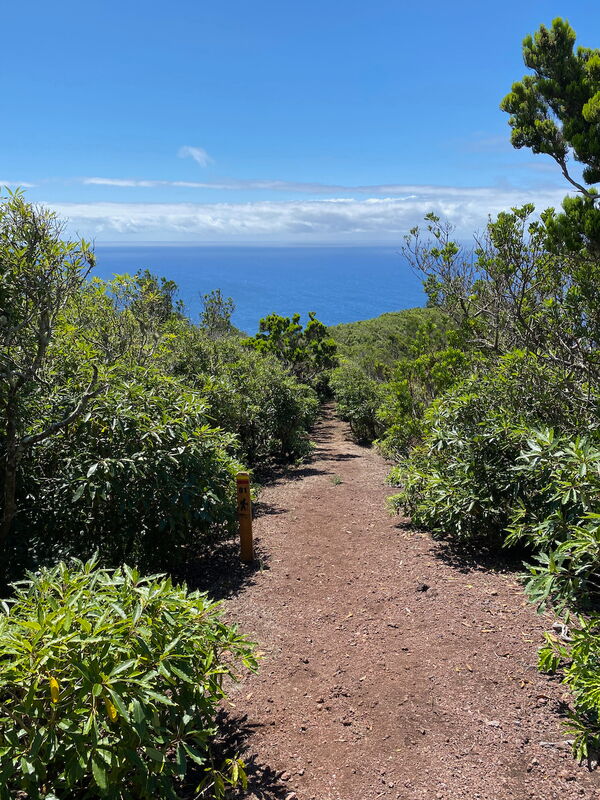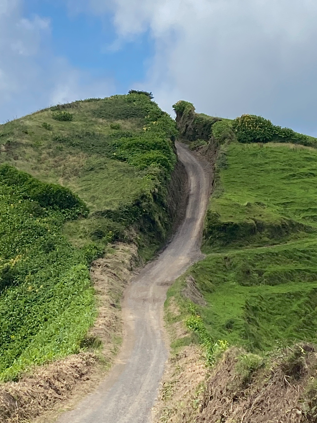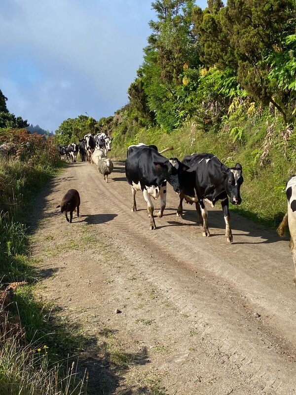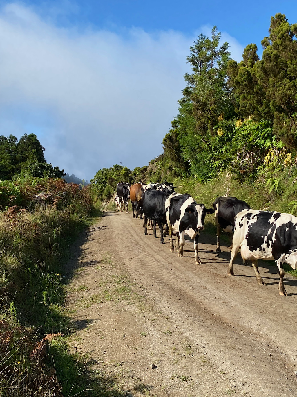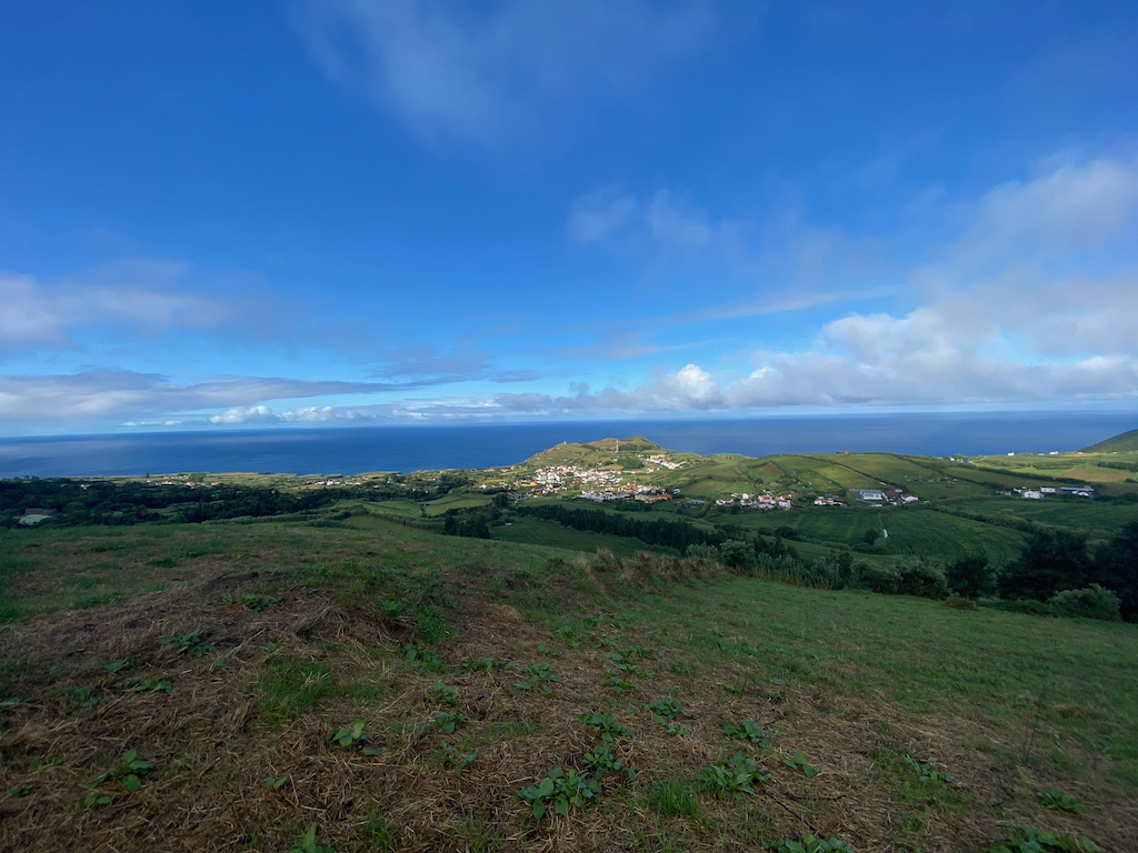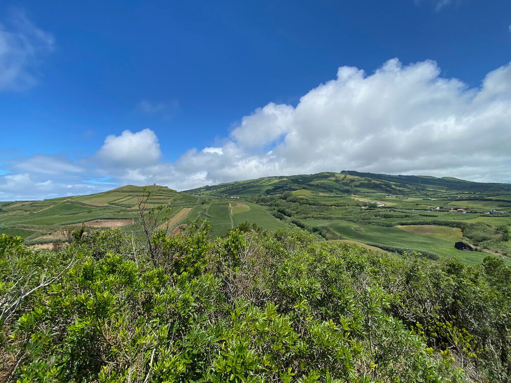 Die nächsten Kilometer geht auf meist landwirtschaftlich genutzten Weg immer wieder auf und ab. Die warme Azoren Sonne scheint mittlerweile aus einem fast wolkenlosen Himmel auf uns hinab und unsere Motivation lässt aufgrund von müden Beinen und schweiß getränkten Klamotten ein wenig nach.