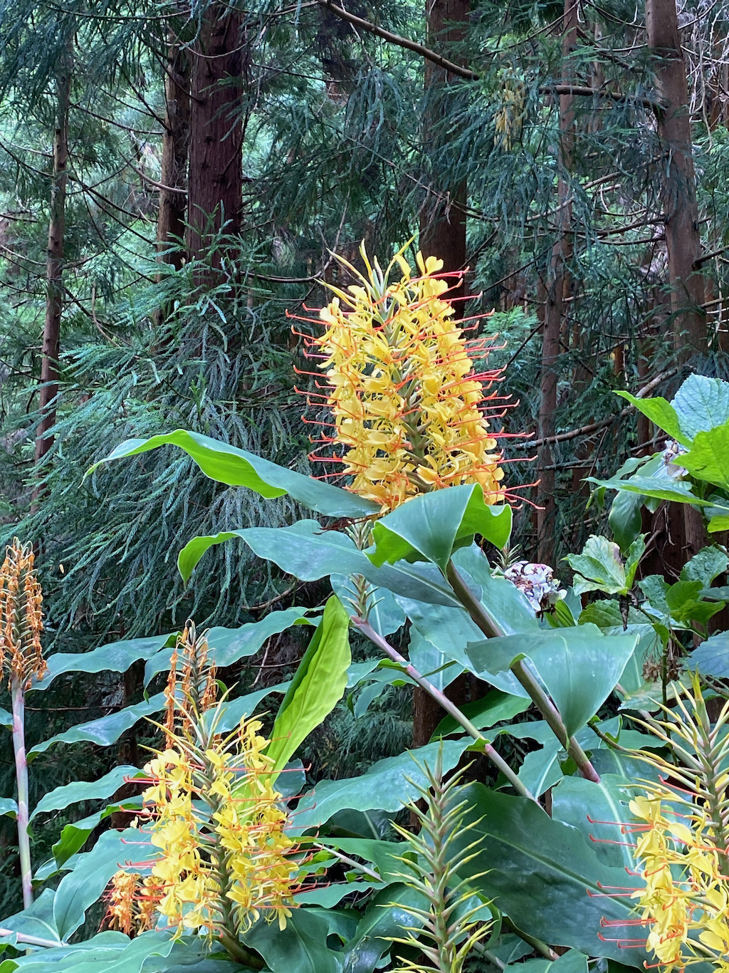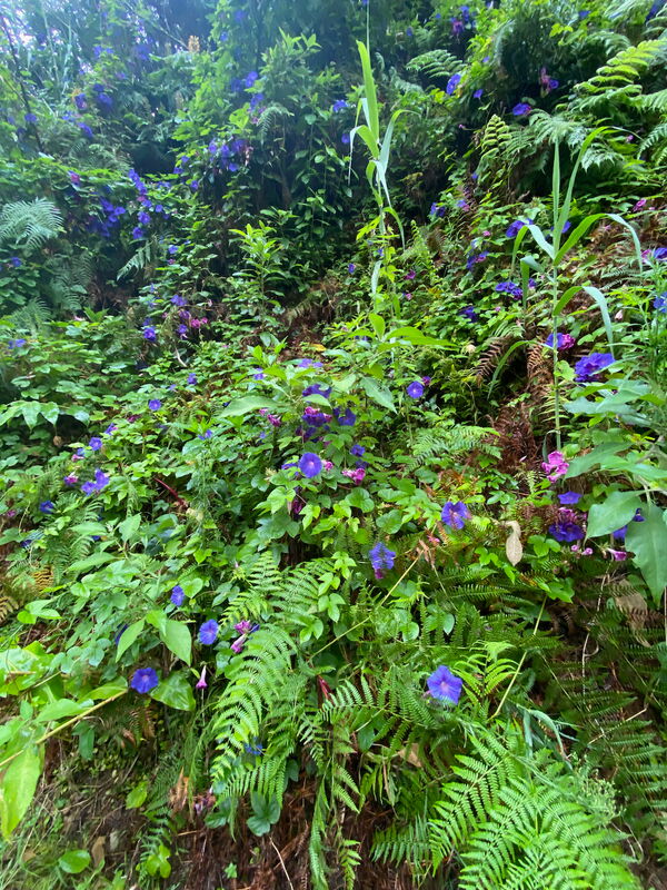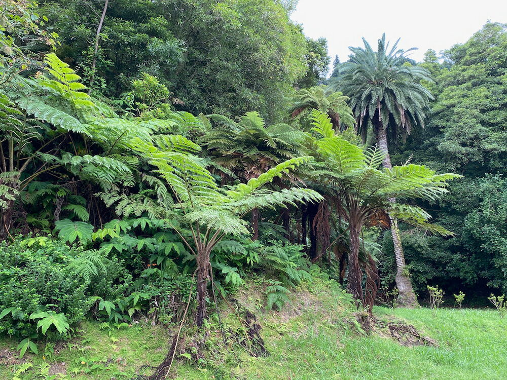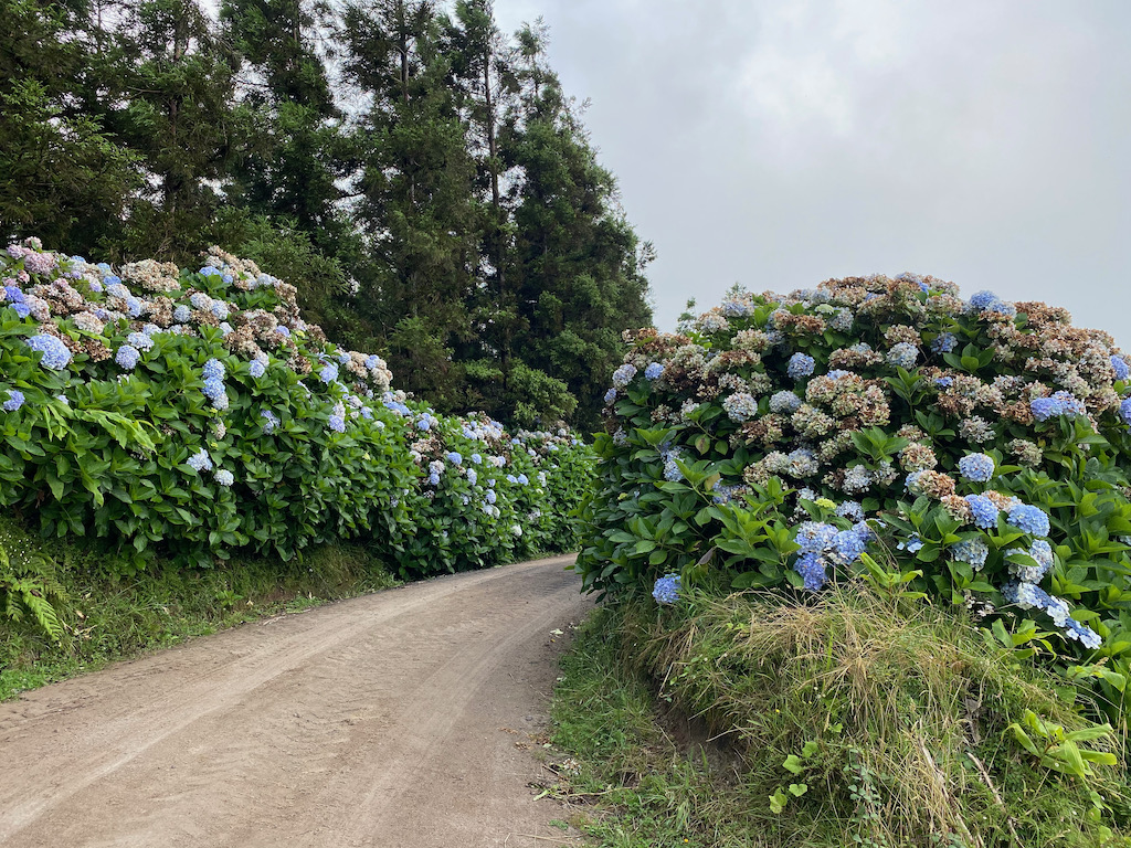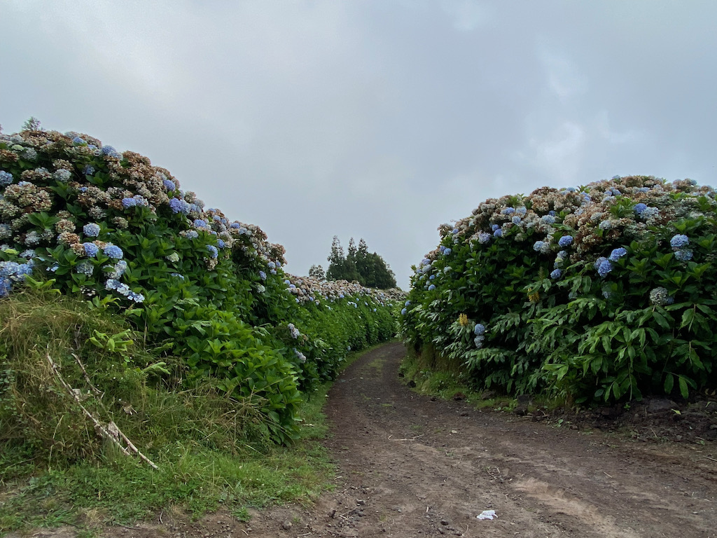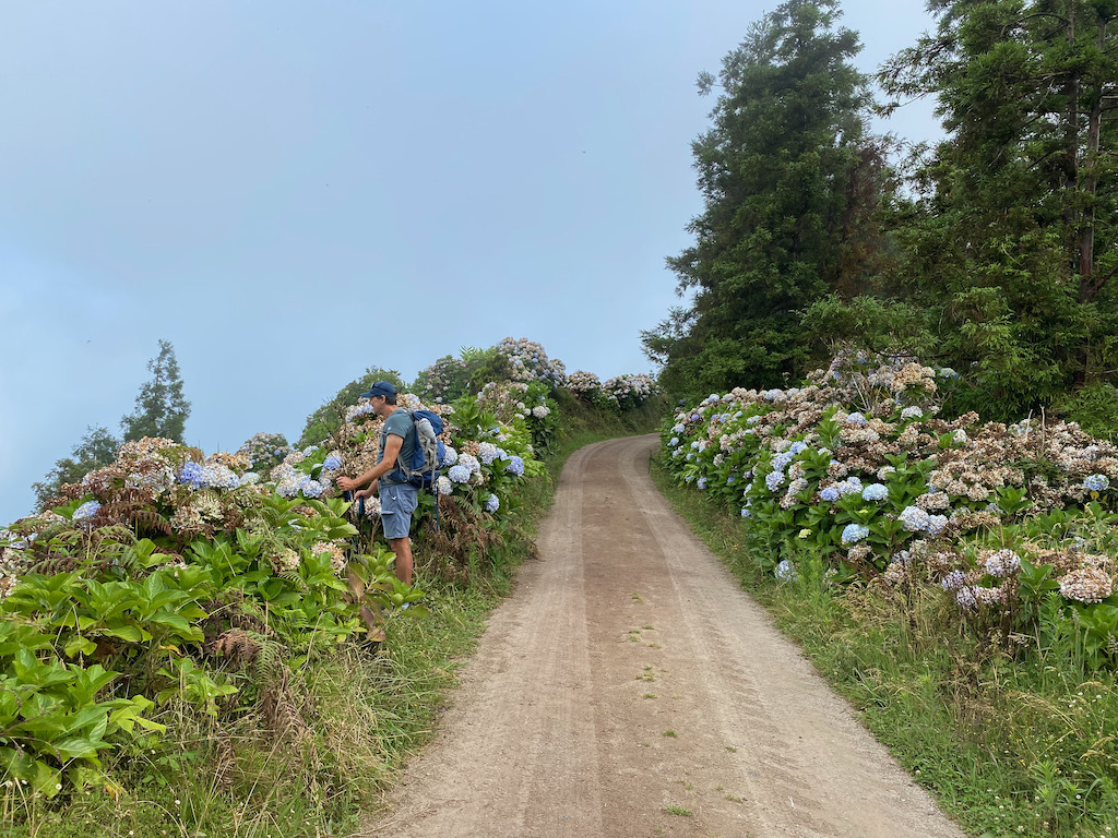 Da wir noch kein Auto zur Verfügung haben, machen wir uns am nächsten Tag auf, um die nähere Umgebung zu erkunden. Schließlich sind wir ja zum Wandern hier. Das Klima auf den Azoren ist subtropisch ozeanisch und die Temperaturschwankungen innerhalb des Jahres sehr gering. Auch wenn der Sommer die wärmste Jahreszeit auf den Azoren ist, muss man täglich mit Regen, Nebel und Wind rechnen. Auch zu Beginn unseres ersten Wandertages ist das Wetter typisch für die Azoren. Wir laufen durch feinen Sprühregen raus aus dem kleinen Ort und hinein in eine dschungelartige Landschaft voller Farne und prachtvoller Blumen.
