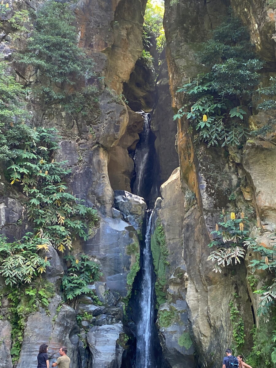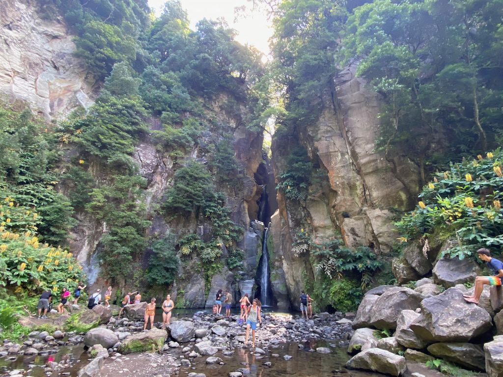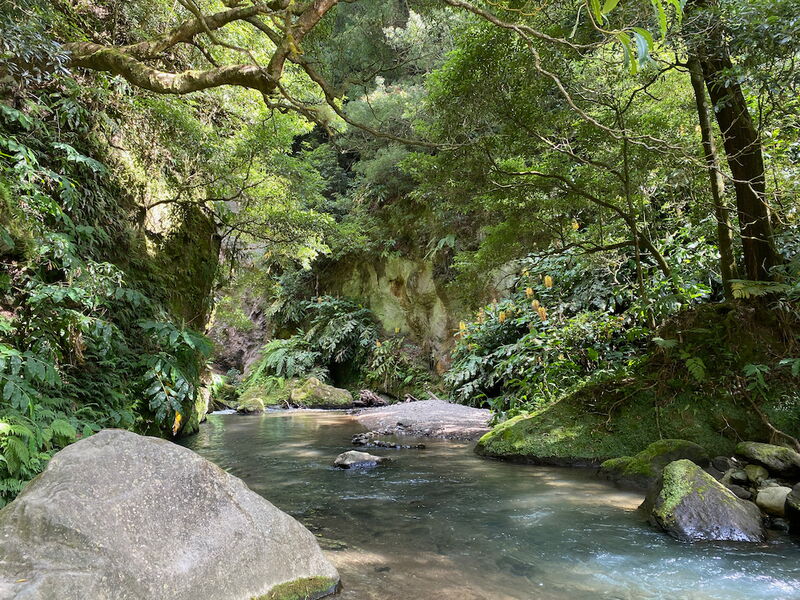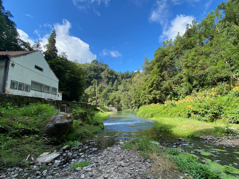Am letzten Tag unserer Azoren Reise geht es auf eine Wanderung zum Wasserfall Salto do Cabrio. Vom Parkplatz an der Hauptstraße nach Ribeira Grande geht es auf einer staubigen Piste zu einem Wasserkraftwerk, welches gespeist durch den Ribeira Grande, der Stromerzeugung dient. Dann führt der Weg uns steil hinab entlang des Flusses in ein wunderschönes kleines Tal.