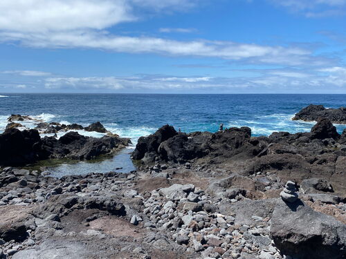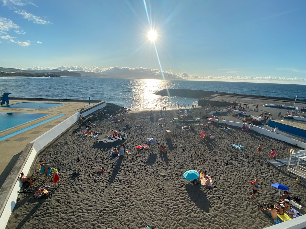 Wir erreichen das ehemalige Fischerdorf Mosteiros und stehen wenig später auf dem schönen Marktplatz im Zentrum des Örtchens.Der Ort liegt direkt am Meer und unser Ziel sind die dunklen Sandstände mit Naturschwimmbecken, die von heißen Quellen erwärmt werden.