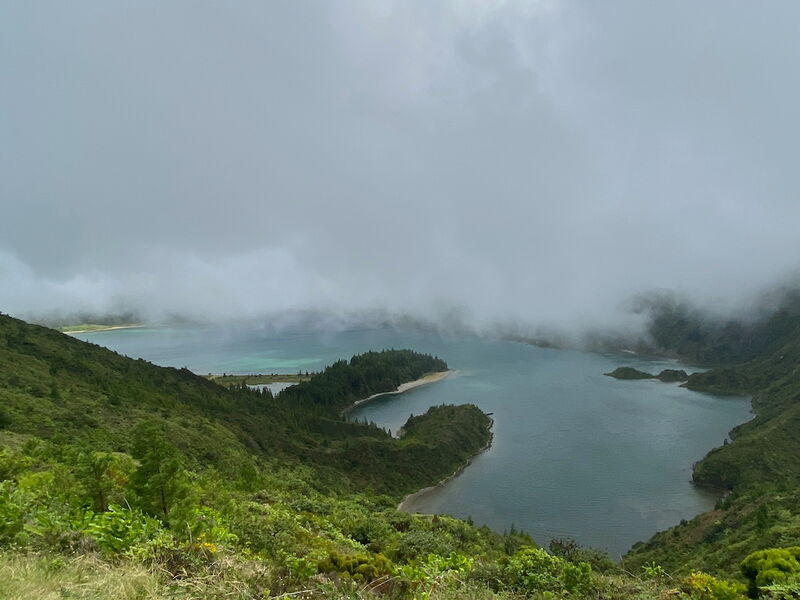 Wir genießen noch ein wenig unseren Aufenthalt vor Ort und machen später noch eine kleine Autotour zum Lagoa do Fogo. Der Kratersee, übersetzt "Feuerlagune", liegt auf 575 m Höhe umgeben von endemischen Lorbeerwald und gilt als das Vogelparadies der Insel. Leider spielt das Wetter nicht so mit. Es ist kühl und stürmt ziemlich heftig, allerdings geben die tiefliegenden Wolken zum Glück das ein oder andere mal den Blick frei auf die "Feuerlagune".