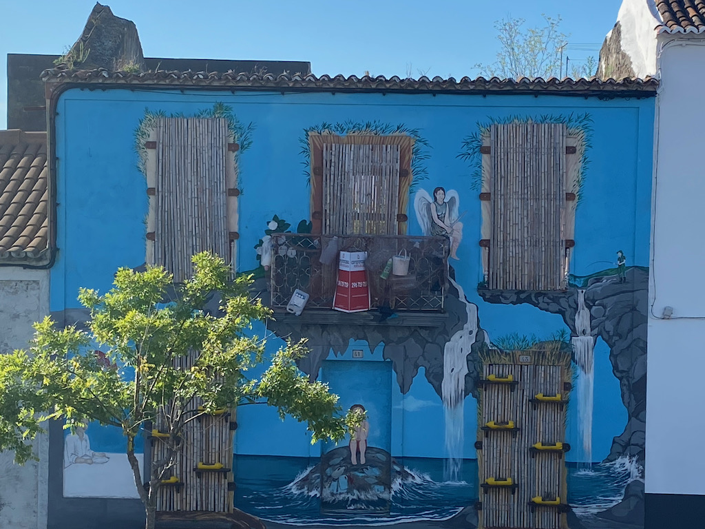 Vom Ortskern geht es durch die Hauptstraße vorbei an schönen bunten Häusern zum Meer. Wie auf der gesamten Insel ist auch in Mosteiros die Rinderzucht ein wichtiger Wirtschaftszweig und auf den grünen Wiesen der Umgebung grasen überall Kühe.