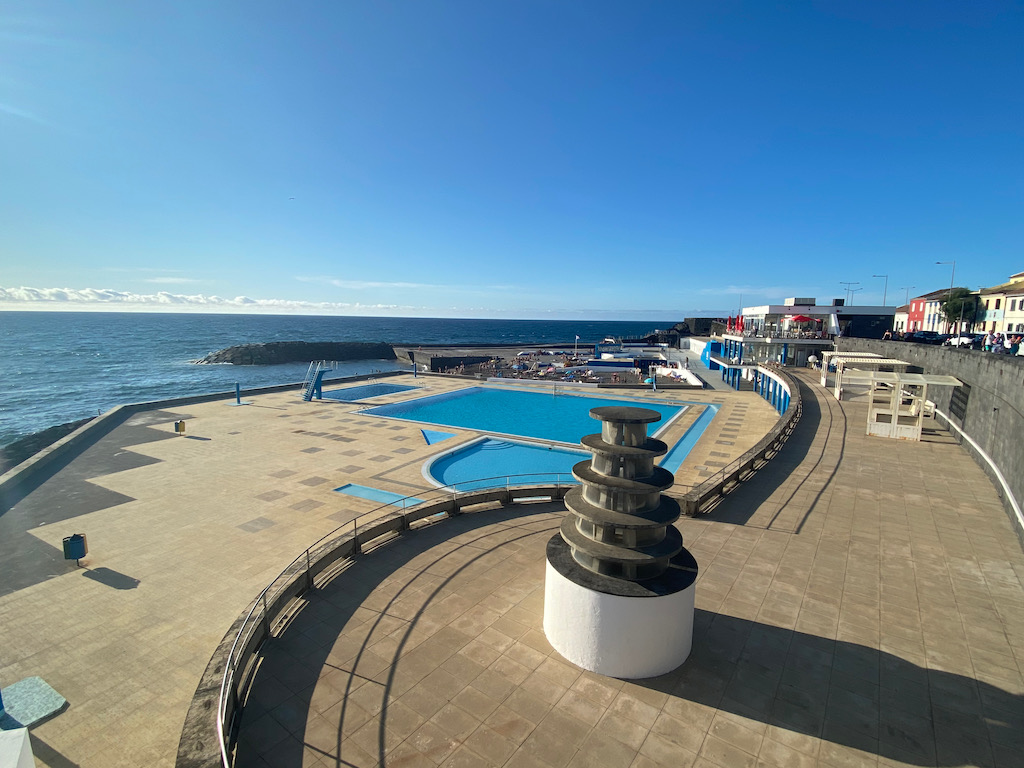 Das Piscinas Municipais das Pocas ist ein sehr modernes Meeresschwimmbad mit vier Pools, sanitären Einrichtungen, kleinem Sandstand und einer Snackbar. Wir suchen uns dort ein schönes Plätzchen und genießen bei Burger und Drinks das sonnige Wetter und die Aussicht auf den weiten Ozean.