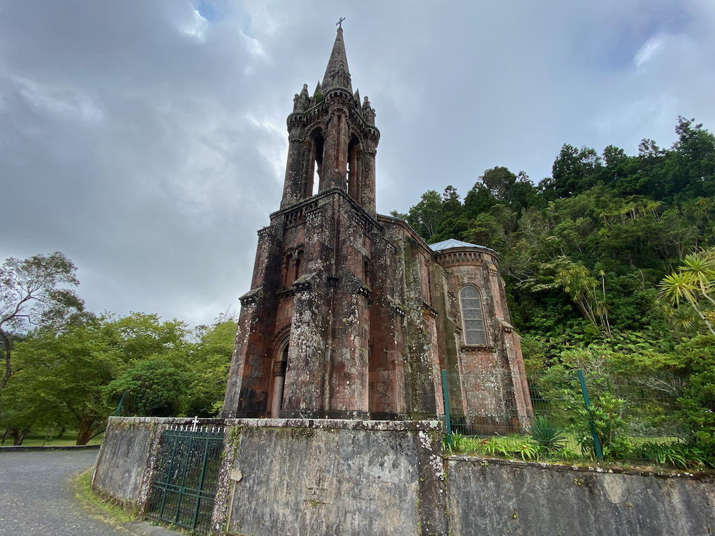 Furnas ist wohl DER Thermal-Badeort auf den Azoren und war schon im 17. Jh. für die Heilkraft seiner Wässer bekannt. Auf unserer geplanten 10 km Wanderung parken wir unser Auto auf einem kleinen Wanderparkplatz direkt am See und erreichen wenig später die neugotische Capela de Nossa Senhora das Vitorias.