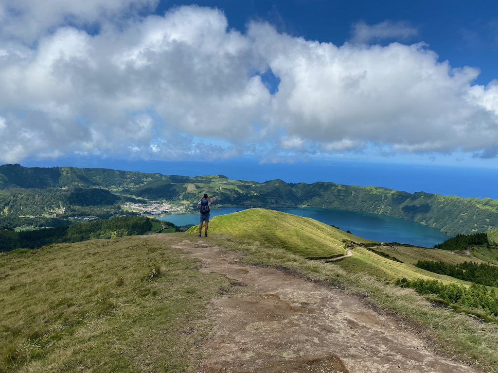 Wir bewegen uns weiter auf dem Grat des riesigen Vulkankraters hoch über der Stadt Sete Cidades und können gar nicht genug bekommen von der tollen Panoramaaussicht auf die Vulkankrater und die beiden blau-grün schimmernden Seen.