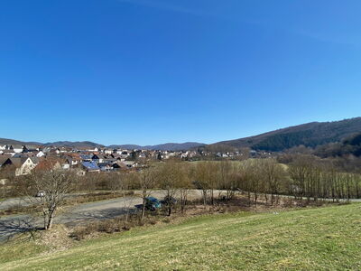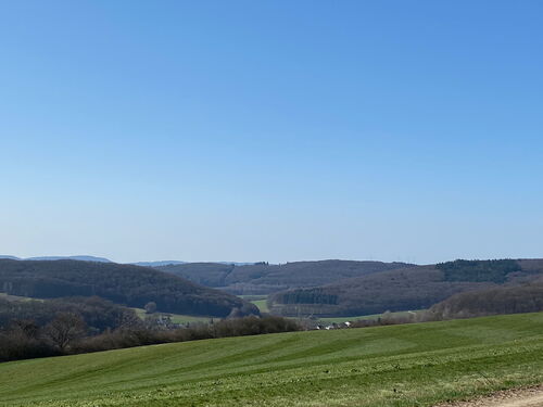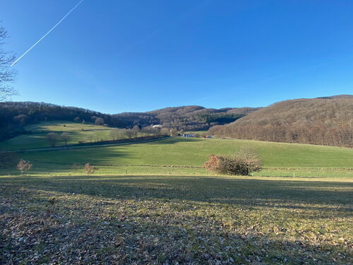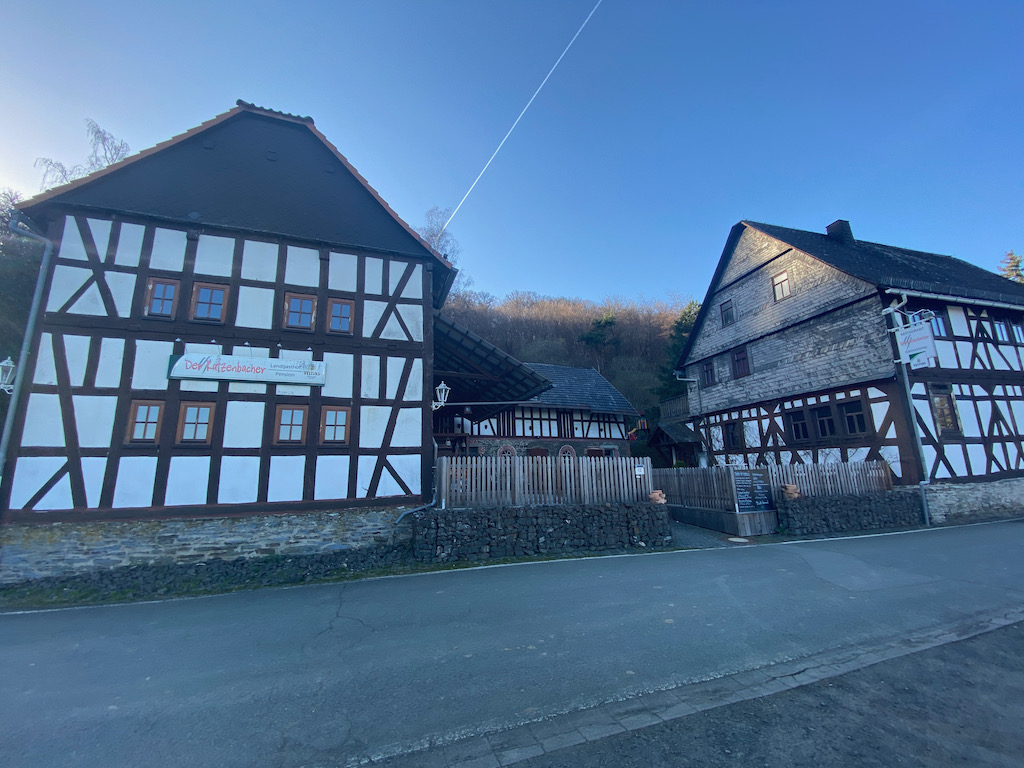 Der Blick auf das idyllisch gelegene Katzenbachtal lässt all meine Müdigkeit vergessen. Ich wandere durch den mit 35 Einwohnern kleinsten Stadtteil von Biedenkopf vorbei am Landgastof "Der Katzenbacher". In nicht Corona Zeiten ein traumhafter Ort für eine Übernachtung inklusive Abendessen mit Blick auf dieses traumhafte Tal.