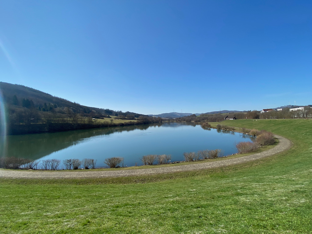 Mein nächstes Etappenziel ist der Perftstausee ihm Ortsrand von Breidenstein. Der nach einer Flutkatastrophe im Jahr 1984 gebaute Stausee dient in erster Linie dem Hochwasserschutz für Perf und Lahn ist aber auch beliebtes Ausflugsziel im Sommer mit Badestrand, Restaurant und mobilem Kiosk.
