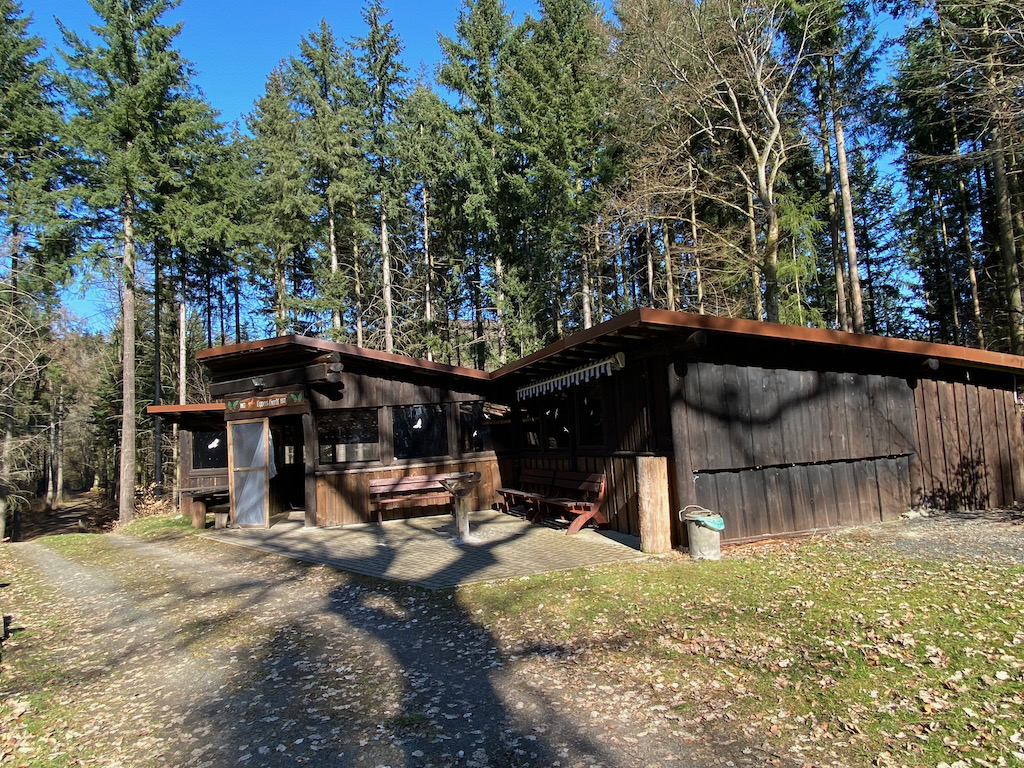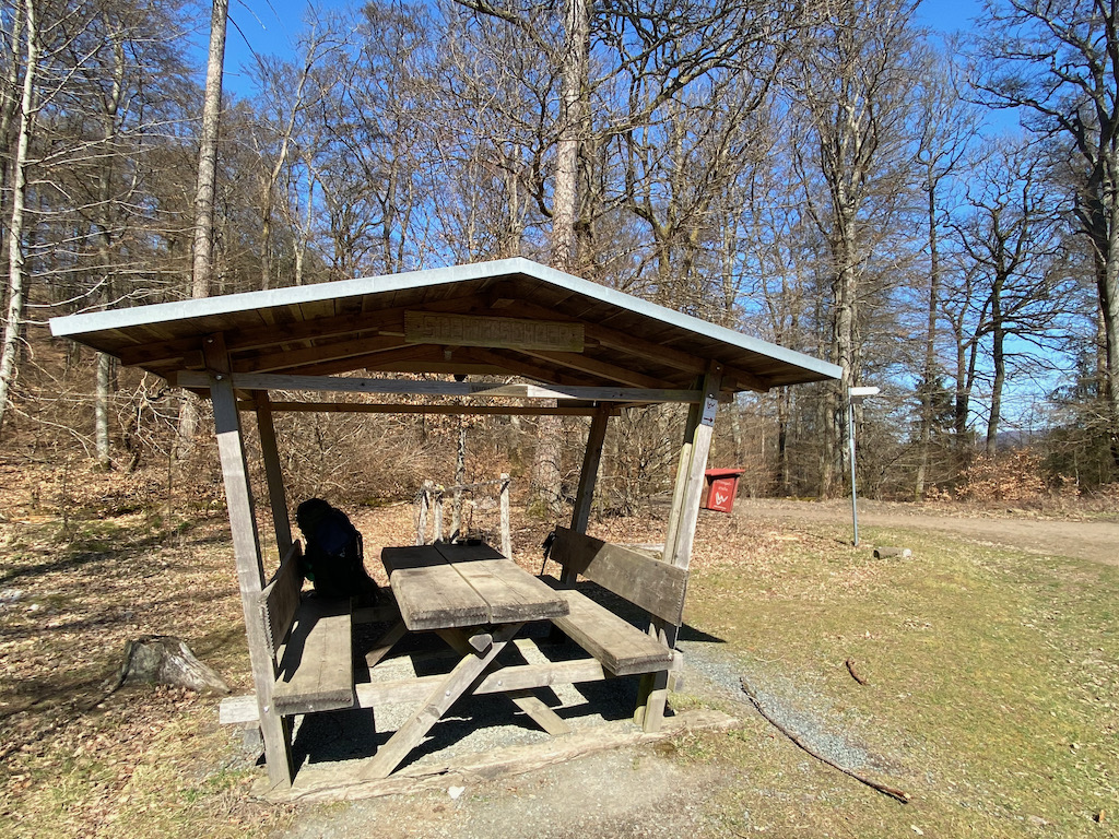 Vor mit taucht die Schutzhütte "Stehtischler Alm" auf, eine von soviel schönen Schutzhütten auf dem Lahnwanderweg.