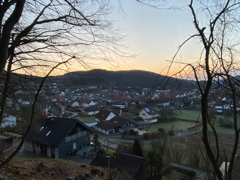 Ich laufe durch den Kurpark der Stadt und erreiche nach einem knappen Kilometer das erste Waldstück. Nun geht es knackig hinauf zum Hausberg von Bad Laasphe.