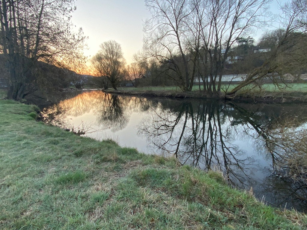 Im kleinen Ort Buchenau laufe ich ein Stück entlang der Lahn und erfreue mich über den Anblick eines kleines Bäckers am Ortseingang. Mit der sehr freundlichen Verkäuferin komme ich kurz ins Gespräch über meine Wanderung, schlürfe wenige Minuten später meinen Kaffee und beiße in ein herzhaftes Laugenbrötchen.