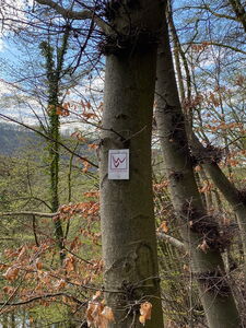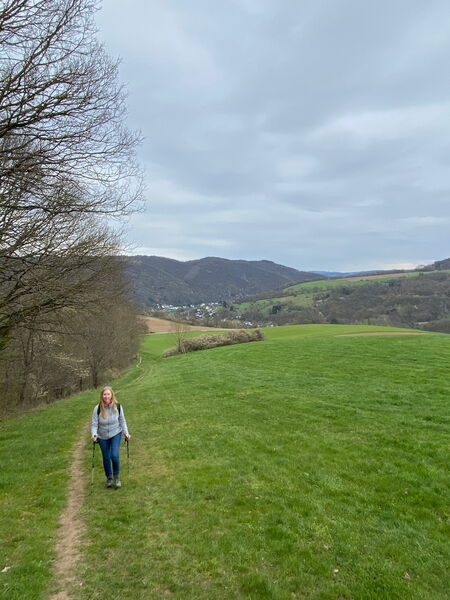 Beim Aufstieg nach Misselberg sind wir zumeist auf breiten Forstwegen unterwegs und blicken durch die dichten Baumkronen immer mal wieder auf der Bergfried der Burg Nassau. Wir wandern vorbei an Obstplantagen und, was wohl sonst, quälen uns mal wieder auf einem steilen Pfad hoch zum Aussichtspunkt Kuxlay. Hier oben weht ein kühler kräftiger Wind und wir nutzen die Pause zum anziehen wärmerer Kleidung und erfreuen uns dem famosen Ausblick auf das Lahntal.