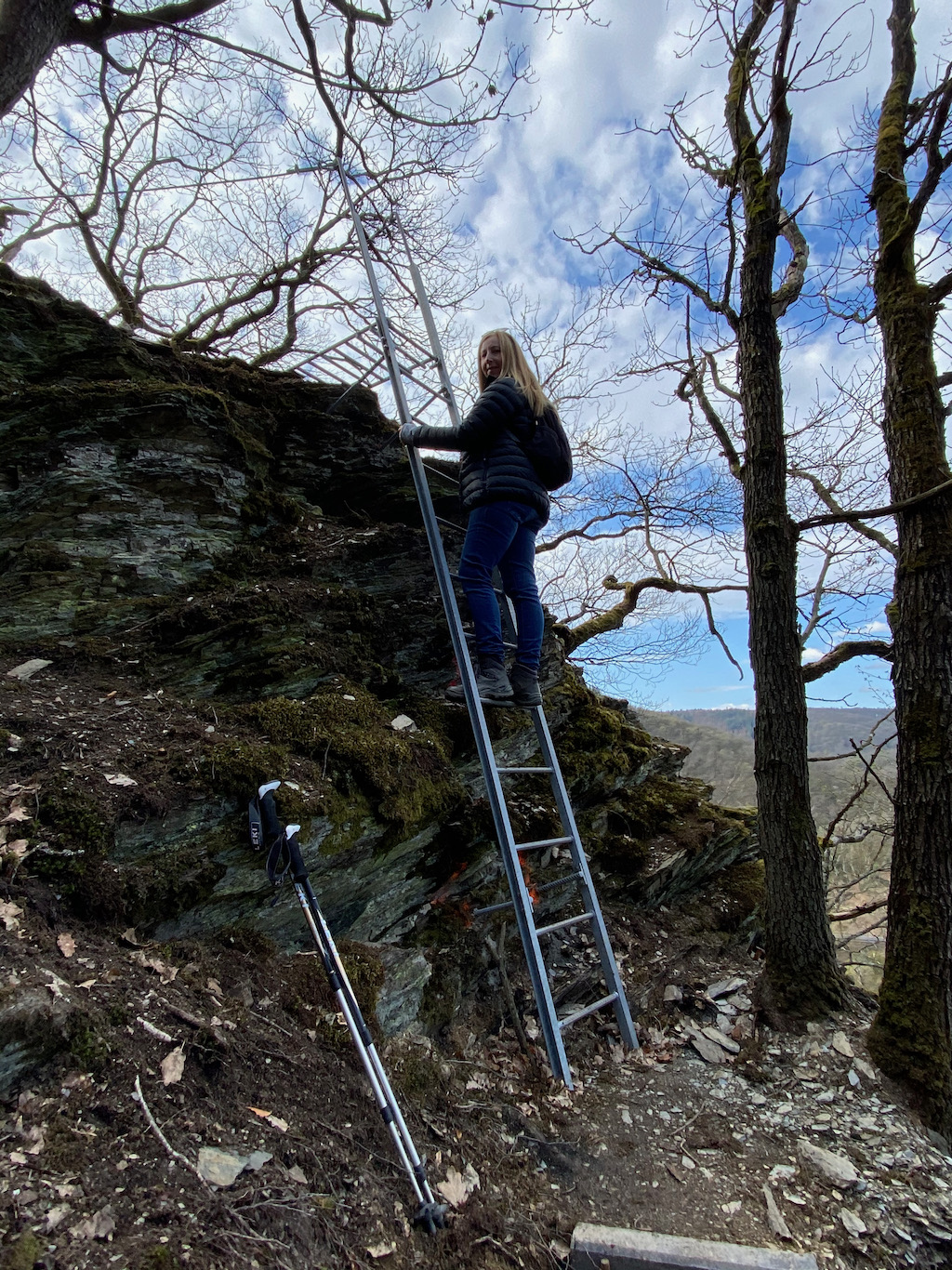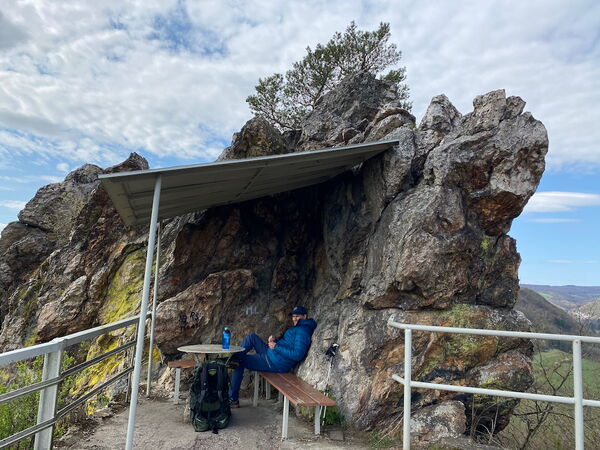 Die nächsten Kilometern führen auf naturbelassenen Pfaden, durch dichten Wald, hinauf zum Aussichtsfelsen Hohe Lay. Der perfekte Ort für einen Mittagssnack mit Blick auf Kloster Arnstein und Schloss Langenau.