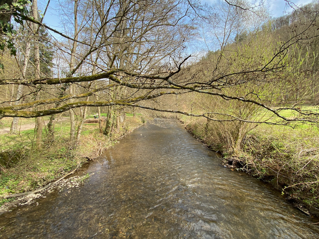 Wir laufen durch das idyllische Mühlbachtal und durchschreiten eine sattgrüne Talaue. Ein Schild warnt vor Wildschweinen, sehen tun wir aber keine. Kurze Zeit später, wie soll es auch anders sein, geht es erneut steil bergan.