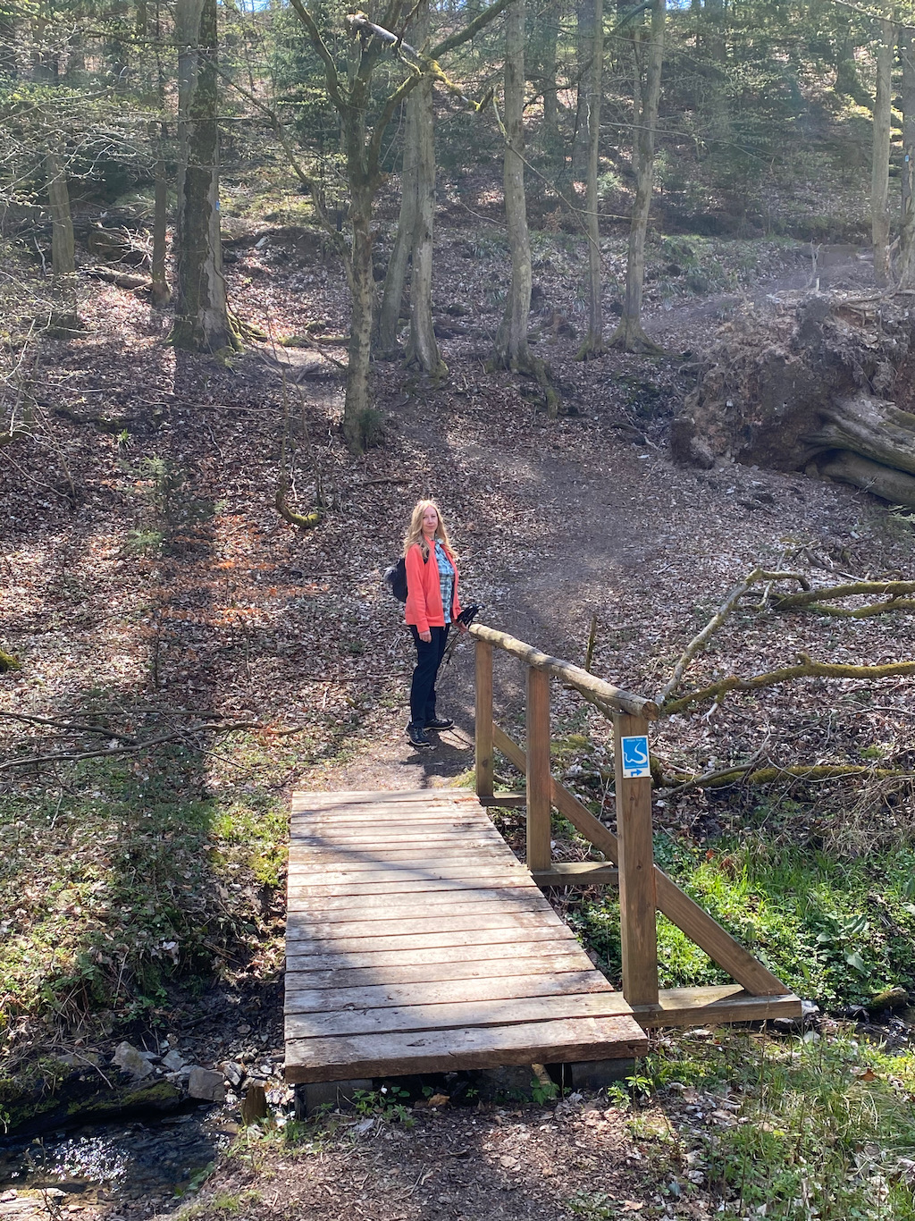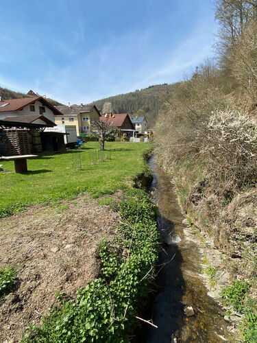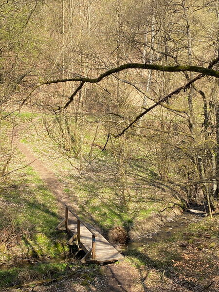 Wir laufen ein Stück entlang der Talstraße durch den Ort und wandern am namensgebenden kleinen Bach vorbei wieder in den Wald hinein. So langsam wird es Zeit für ein kleines Mittagspäuschen. Einen geeigneten Platz zu finden fällt nicht schwer, denn gefühlt alle 500 m läuft man an neu aufgestellten Wanderbänken vorbei.
