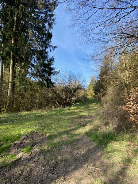 Es folgt ein kurzer Anstieg zum Rabenkopf (466 m), um kurz darauf einem schmalen Wanderpfad folgend den Abstieg in Richtung Obergladbach anzugehen. Wie in vielen anderen Regionen Deutschlands auch sind hier im Taunus die Schäden durch den Borkenkäfer unübersehbar und wir kraxeln des öfteren über abgeholzte Baumstämme.