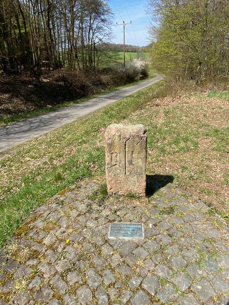 Auf unserem Weg in Richtung Niedergladbach passieren wir einen alten historischen Grenzstein, der im 16. Jahrhundert die Grenze zwischen Kloster Eberbach und Hof Meppen signalisierte.