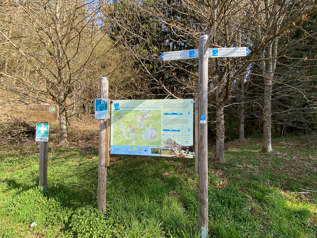 Nach einer 180 km langen Autofahrt stehen wir bei herrlichem Sonnenschein und noch etwas kühlen 10 Grad auf dem Wanderparkplatz Kellerweg. Eine große Informationstafel beschreibt ausführlich den Verlauf des Weges.