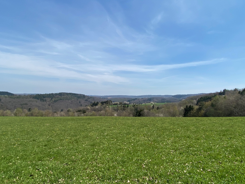 Schon bald erreichen wir den Roterberg auf 460 m Höhe und staunen über die fantastische Aussicht auf die Hügel des Taunus und das satte Grün der Almen.