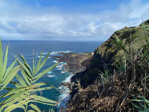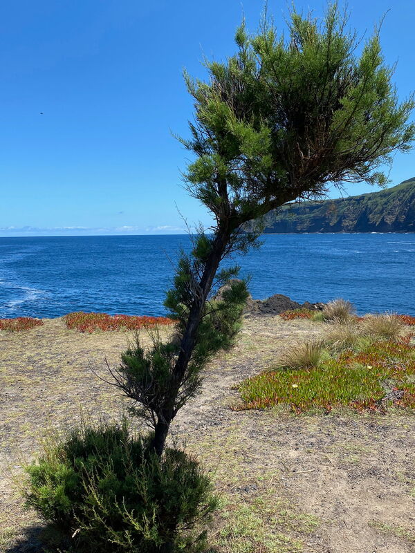 Da wir am nächsten Tag immer noch ohne Mietwagen sind, entscheiden wir uns mit dem Bus in Richtung Nordwesten nach Mosteiros zu fahren. Wir laufen zur Bushaltestelle nach Ginetes und warten...warten...warten...bis nach über einer Stunde endlich der Bus kommt. Während der knapp 40 minütigen Fahrt genießen wir die Ausblicke aufs Meer und die immergrüne Landschaft.