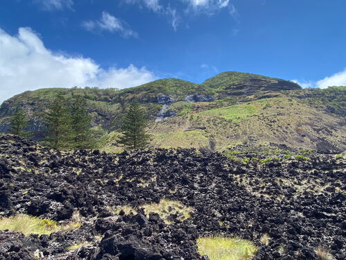 Wir folgen der Wegmarkierung, wandern wie fast überall auf der Insel durch eine üppig bewachsenes Waldgebiet und stehen plötzlich vor einem kleinen Badesee hinter dem sich die Fluten des Wasserfalls hinunterstürzen.