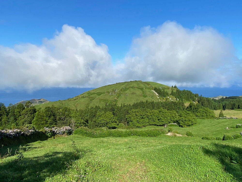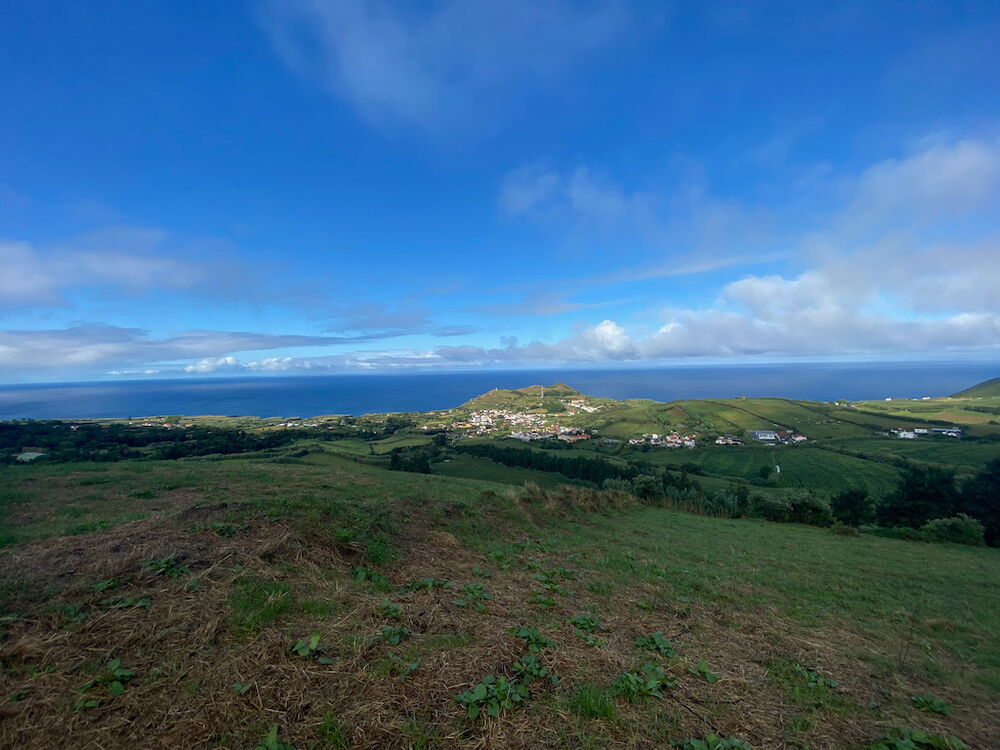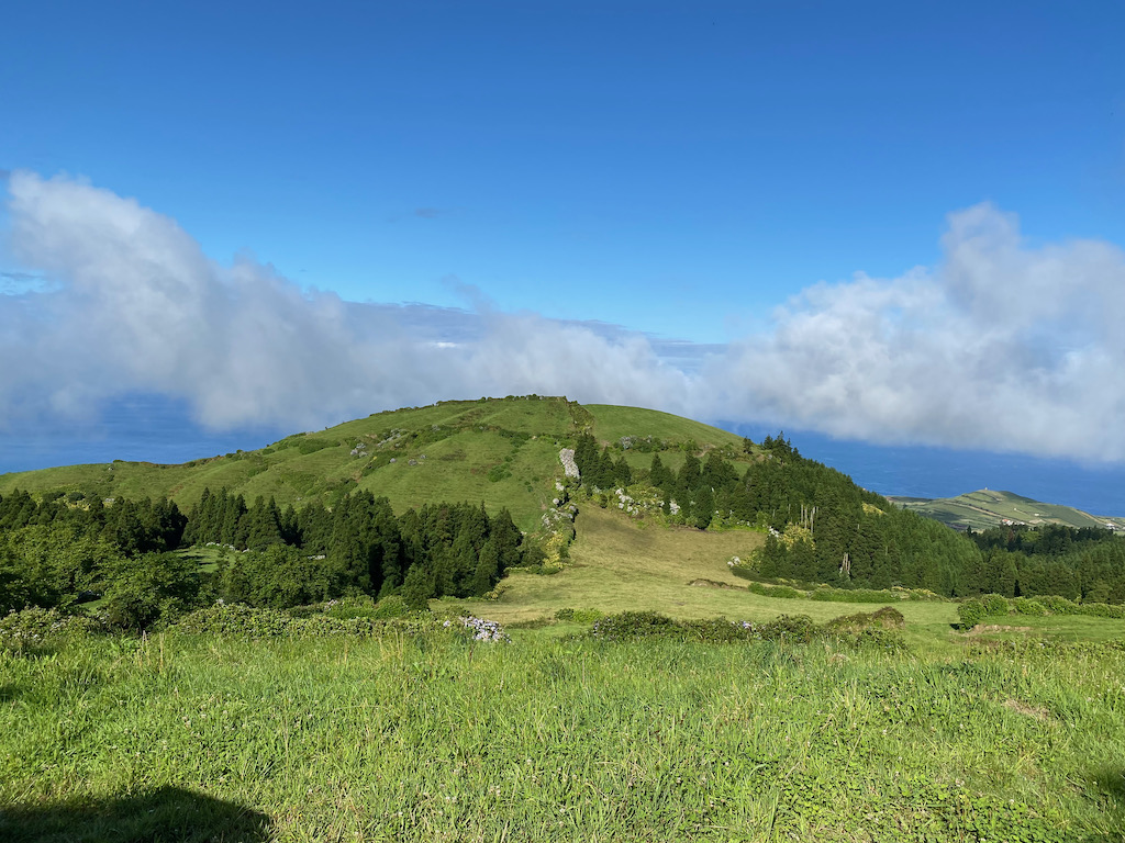 Die nächsten Kilometer geht auf meist landwirtschaftlich genutzten Weg immer wieder auf und ab. Die warme Azoren Sonne scheint mittlerweile aus einem fast wolkenlosen Himmel auf uns hinab und unsere Motivation lässt aufgrund von müden Beinen und schweiß getränkten Klamotten ein wenig nach.