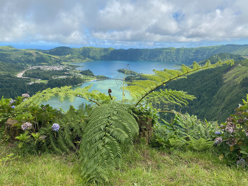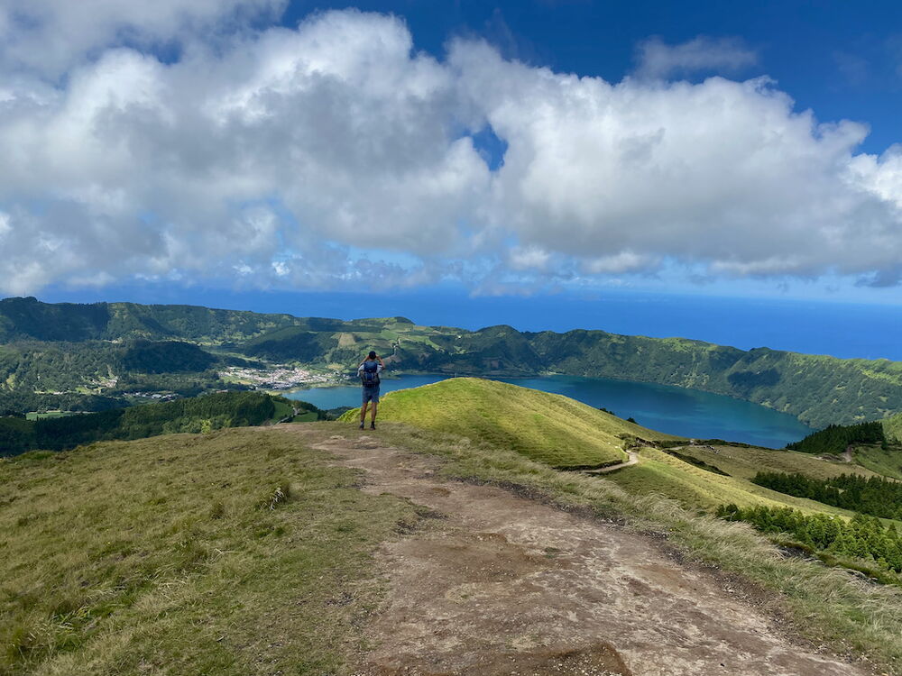 Wir bewegen uns weiter auf dem Grat des riesigen Vulkankraters hoch über der Stadt Sete Cidades und können gar nicht genug bekommen von der tollen Panoramaaussicht auf die Vulkankrater und die beiden blau-grün schimmernden Seen.