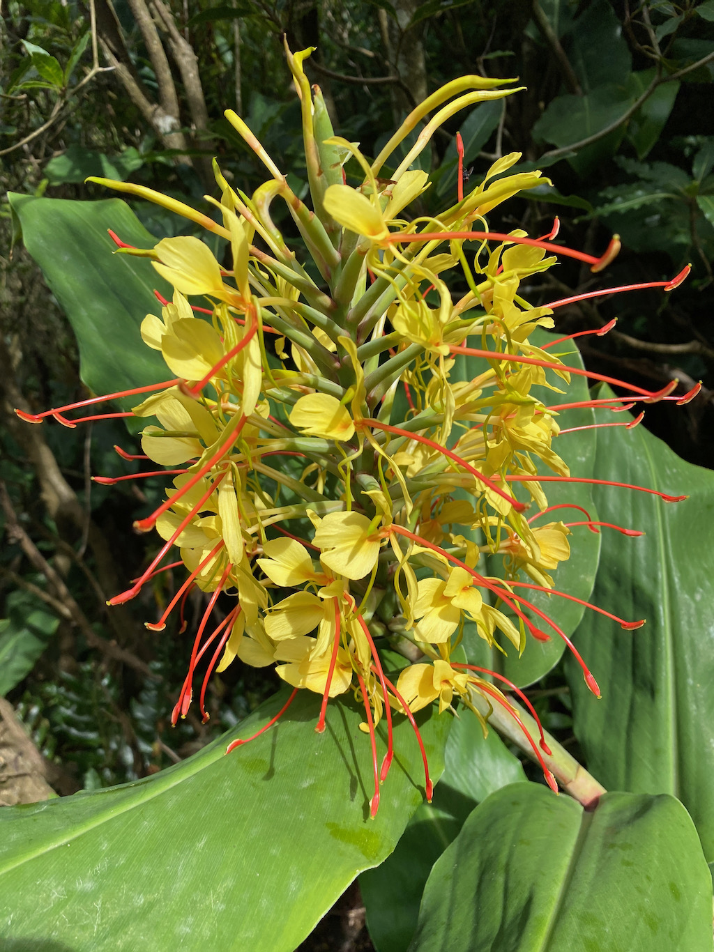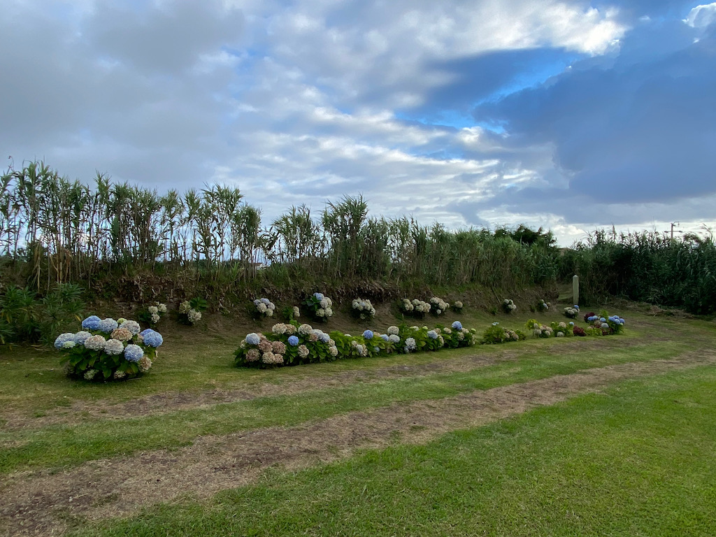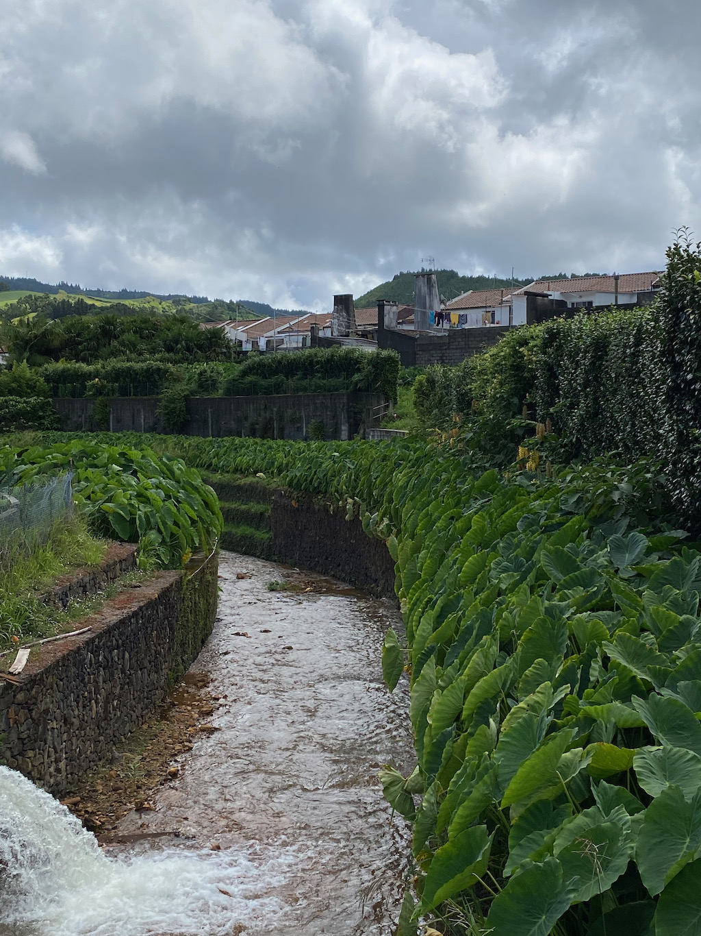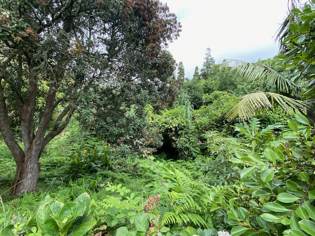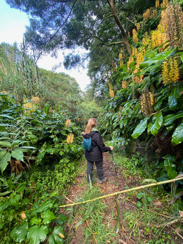 Da wir noch kein Auto zur Verfügung haben, machen wir uns am nächsten Tag auf, um die nähere Umgebung zu erkunden. Schließlich sind wir ja zum Wandern hier. Das Klima auf den Azoren ist subtropisch ozeanisch und die Temperaturschwankungen innerhalb des Jahres sehr gering. Auch wenn der Sommer die wärmste Jahreszeit auf den Azoren ist, muss man täglich mit Regen, Nebel und Wind rechnen. Auch zu Beginn unseres ersten Wandertages ist das Wetter typisch für die Azoren. Wir laufen durch feinen Sprühregen raus aus dem kleinen Ort und hinein in eine dschungelartige Landschaft voller Farne und prachtvoller Blumen.