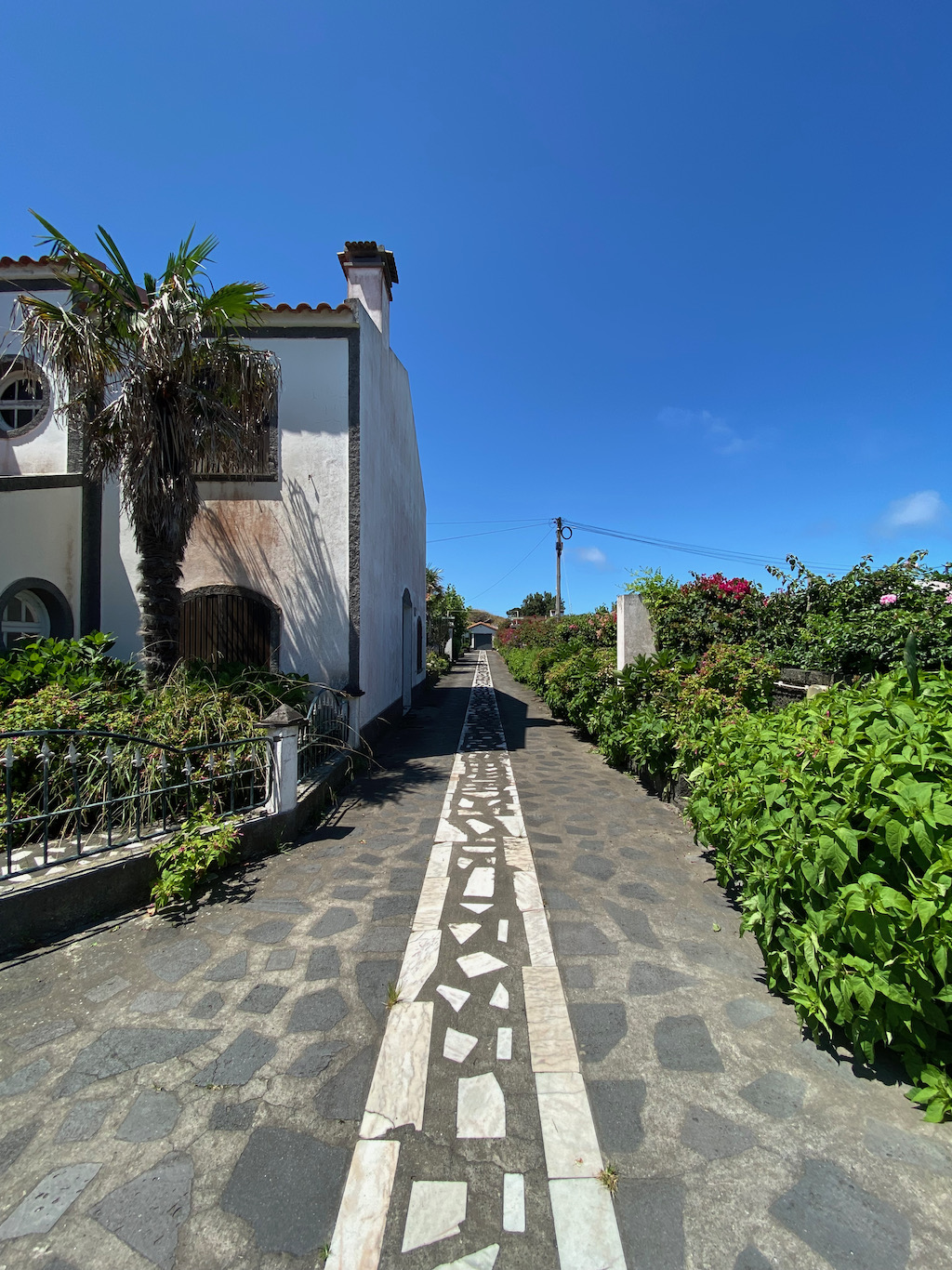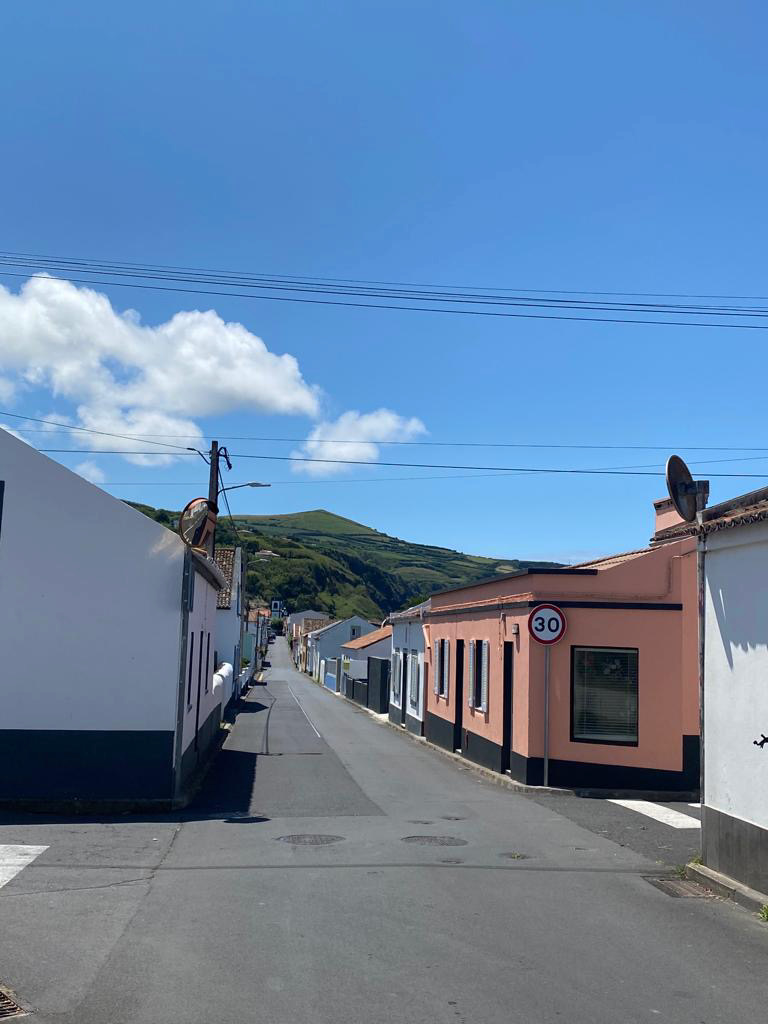 Vom Ortskern geht es durch die Hauptstraße vorbei an schönen bunten Häusern zum Meer. Wie auf der gesamten Insel ist auch in Mosteiros die Rinderzucht ein wichtiger Wirtschaftszweig und auf den grünen Wiesen der Umgebung grasen überall Kühe.