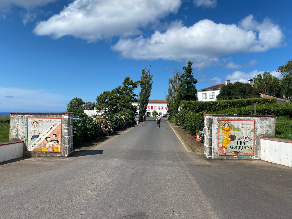 Unser erster Besuch gilt der Plantage Chá Porto Formosa. Eine riesige Metallteekanne hängt neben dem Eingang an einer hohen Mauer. Diese schirmt Fabrik und Plantage von der Hauptstraße ab.
