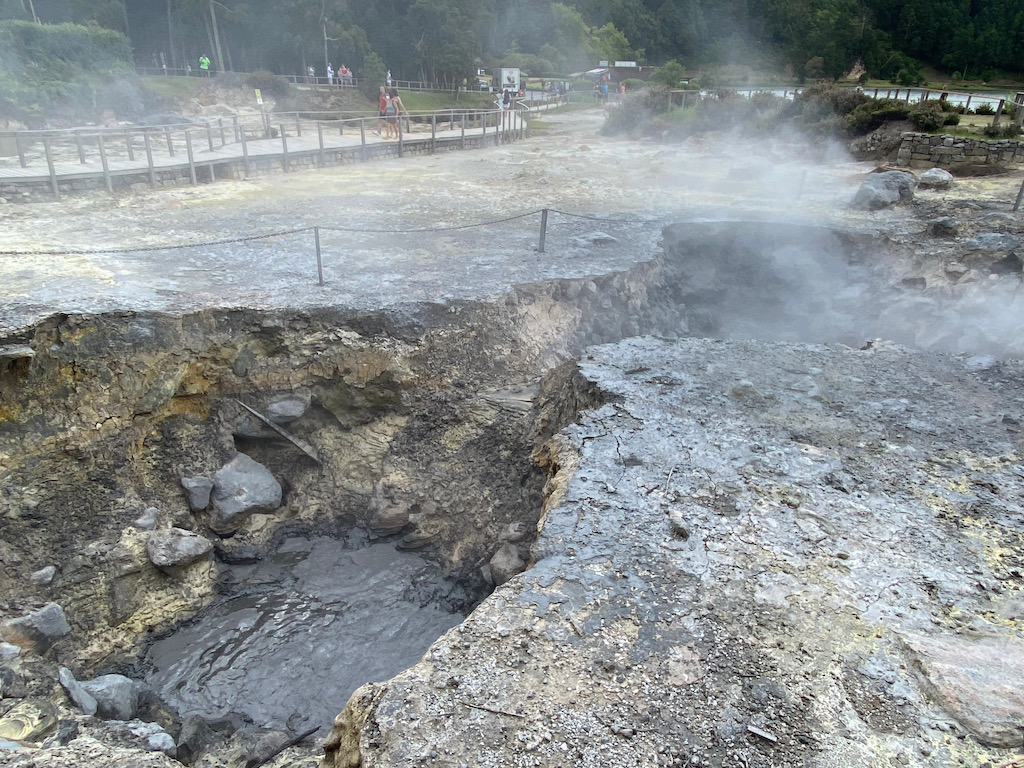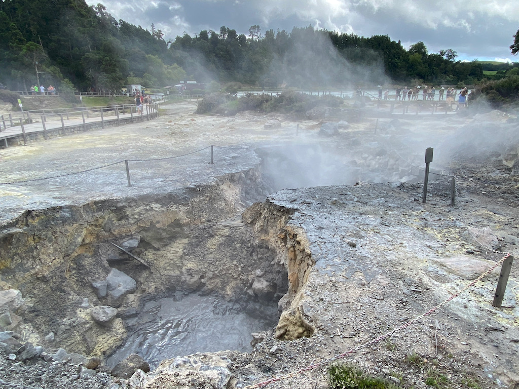 Einige Wanderkilometer weiter erreichen wir die Caldeiras da Lagoa das Furnas. Zwei Thermalfelder mit blubbernden Schlammlöchern und kochenden Quellen. Hier dampft es das ganze Jahr über und in der Luft liegt ein stechender Schwefelgeruch.
