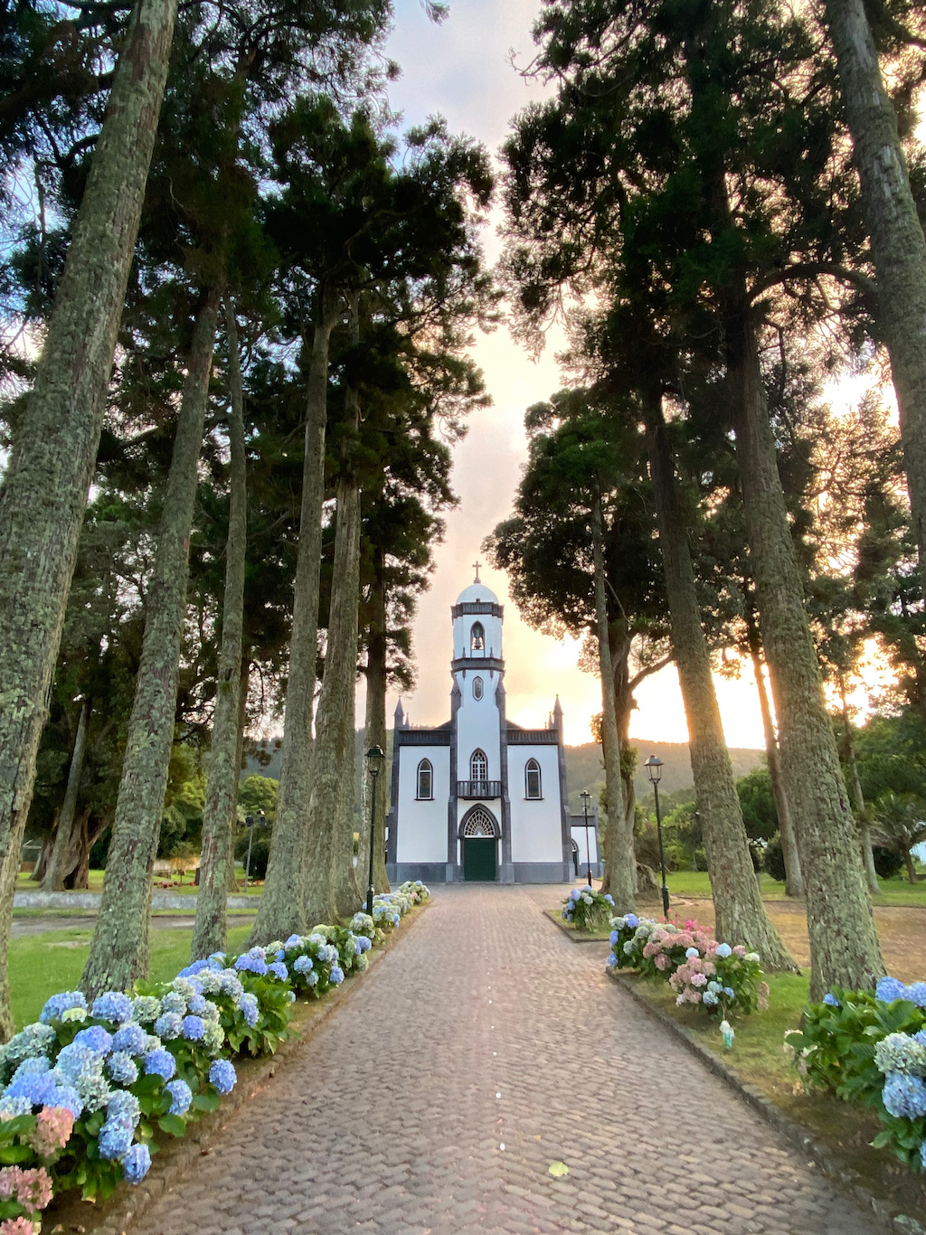 Furnas ist wohl DER Thermal-Badeort auf den Azoren und war schon im 17. Jh. für die Heilkraft seiner Wässer bekannt. Auf unserer geplanten 10 km Wanderung parken wir unser Auto auf einem kleinen Wanderparkplatz direkt am See und erreichen wenig später die neugotische Capela de Nossa Senhora das Vitorias.