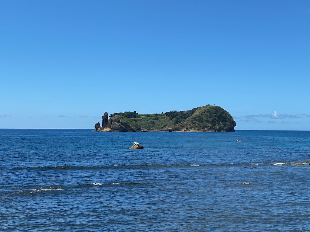 Bevor es zurück zum Hafen geht, macht das Boot noch einen kleinen Abstecher zur Ilheu de Vila Franca do Campo. Im Inneren der kleinen Vulkaninsel hat sich eine fast kreisrunde Kraterlagune gebildet, die von Einheimischen und Touristen als "natürliches Schwimmbecken" genutzt wird. Mit dem Gelbschnabel-Sturmtaucher und der Fluss-Seeschwalbe brüten zwei Seevögelarten auf den unzugänglichen Felsen.