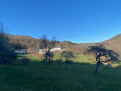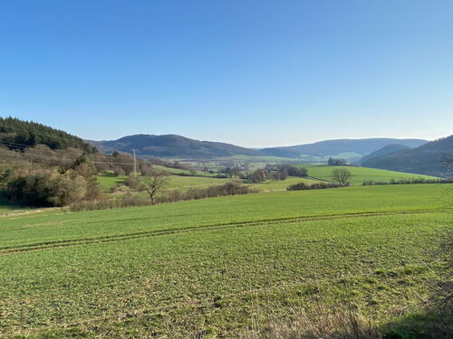 Der Blick auf das idyllisch gelegene Katzenbachtal lässt all meine Müdigkeit vergessen. Ich wandere durch den mit 35 Einwohnern kleinsten Stadtteil von Biedenkopf vorbei am Landgastof "Der Katzenbacher". In nicht Corona Zeiten ein traumhafter Ort für eine Übernachtung inklusive Abendessen mit Blick auf dieses traumhafte Tal.