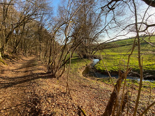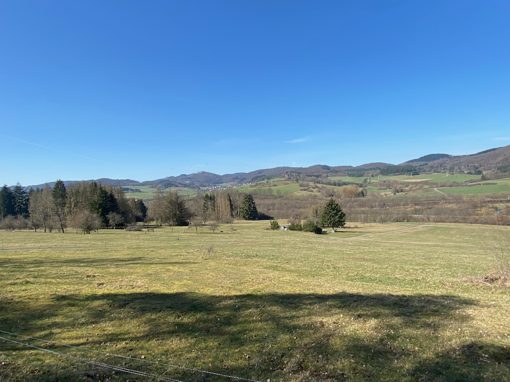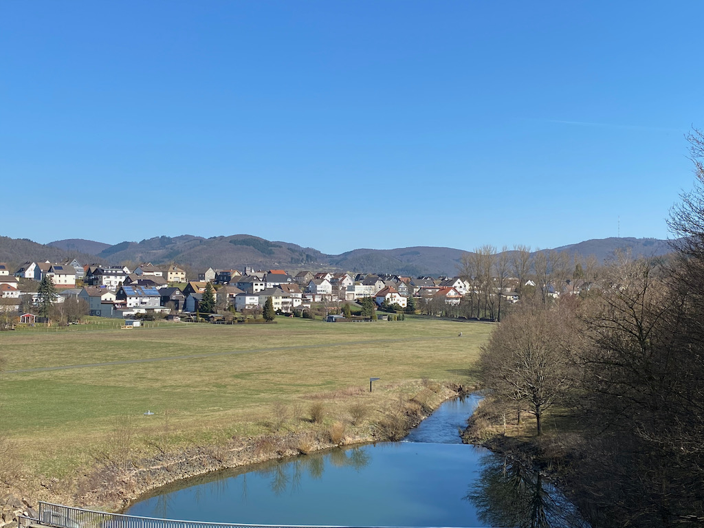 Die Wettervorhersage für meine 2 Wandertage war hervorragend. Viel Sonne und Temperaturen bis zu 24 Grad. Mein Start vom Bahnhof in Bad Laasphe war allerdings noch leicht unterkühlt, aber die Sonne strahlt mir schon von einem wolkenlosen Himmel entgegen.