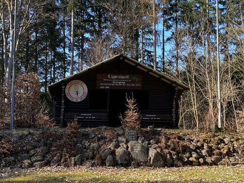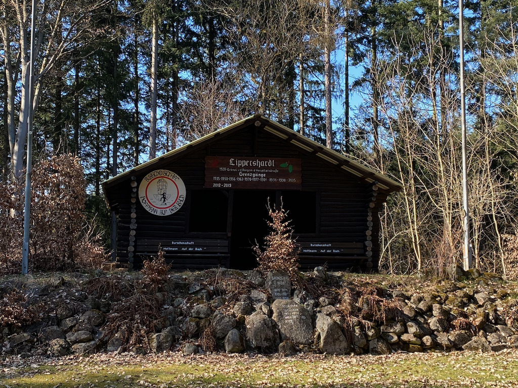 Vor mit taucht die Schutzhütte "Stehtischler Alm" auf, eine von soviel schönen Schutzhütten auf dem Lahnwanderweg.
