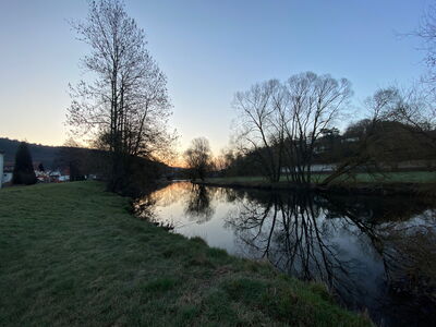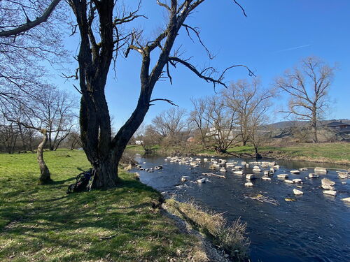 Es geht nochmal durch dichten Wald bis ich in Caldern wieder die Lahn erreiche. Auf einer kleinen Wiese direkt an der Lahn lege ich unter einem Schatten spendenden Baum eine Pause ein.