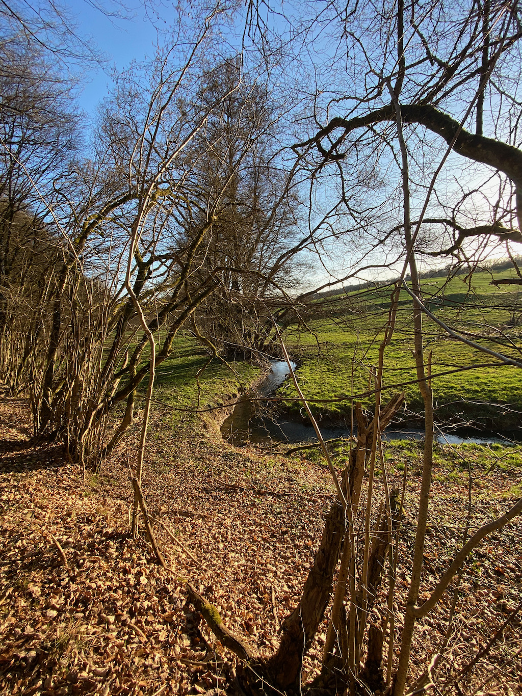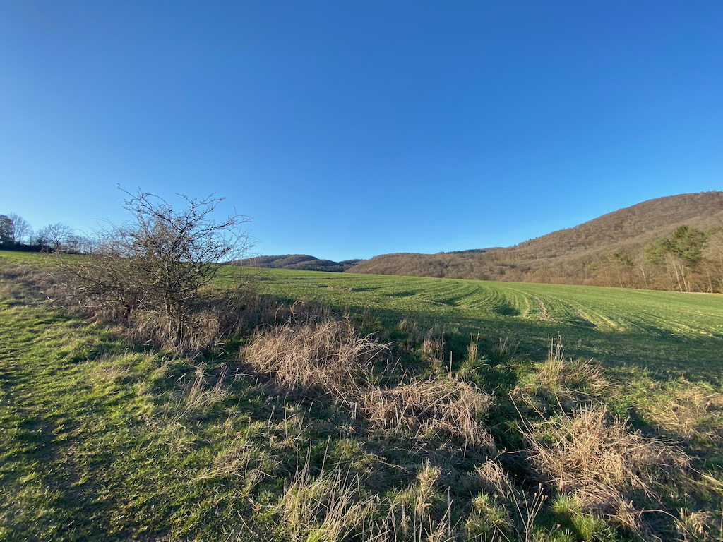Die nächsten Kilometer führen sehr abwechslungsreich durch schöne Wälder und über Wiesen und Felder. Die Sonne strahlt im wärmer von einem wolkenlosen Himmel und schon bald befinde ich mich in einem tranceartigen Wanderflow.
