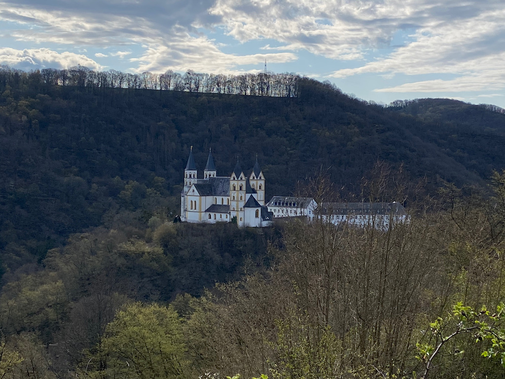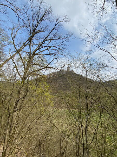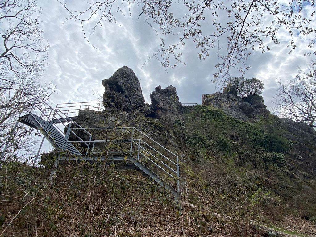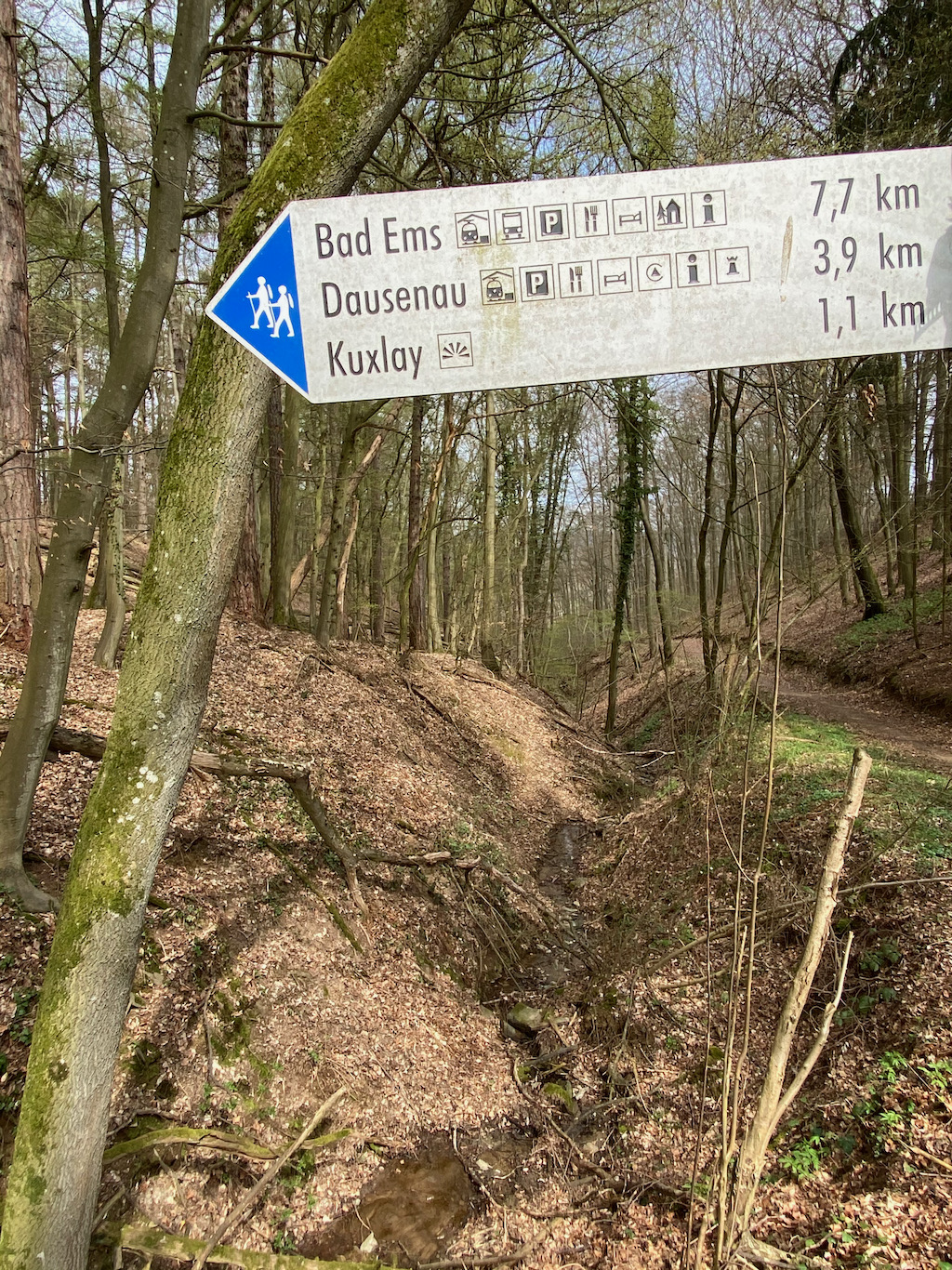 Beim Aufstieg nach Misselberg sind wir zumeist auf breiten Forstwegen unterwegs und blicken durch die dichten Baumkronen immer mal wieder auf der Bergfried der Burg Nassau. Wir wandern vorbei an Obstplantagen und, was wohl sonst, quälen uns mal wieder auf einem steilen Pfad hoch zum Aussichtspunkt Kuxlay. Hier oben weht ein kühler kräftiger Wind und wir nutzen die Pause zum anziehen wärmerer Kleidung und erfreuen uns dem famosen Ausblick auf das Lahntal.