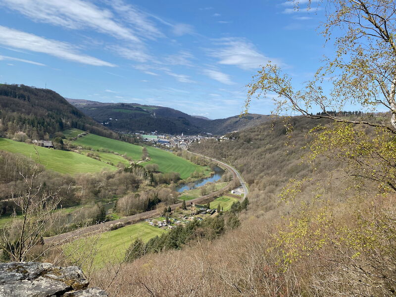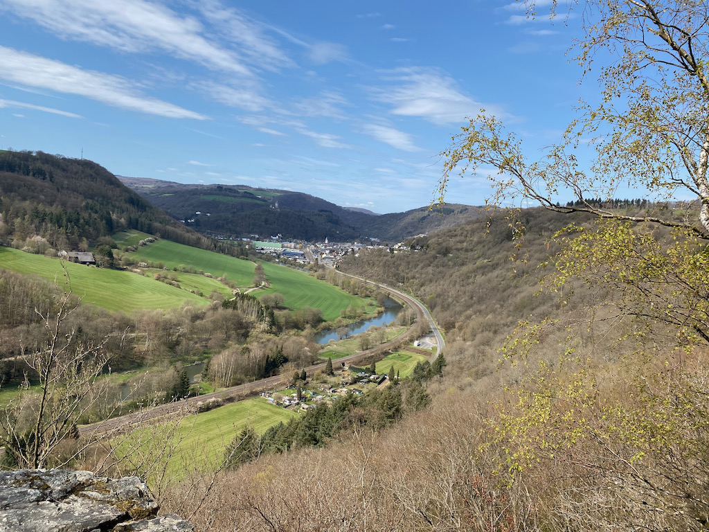 Die nächsten Kilometern führen auf naturbelassenen Pfaden, durch dichten Wald, hinauf zum Aussichtsfelsen Hohe Lay. Der perfekte Ort für einen Mittagssnack mit Blick auf Kloster Arnstein und Schloss Langenau.