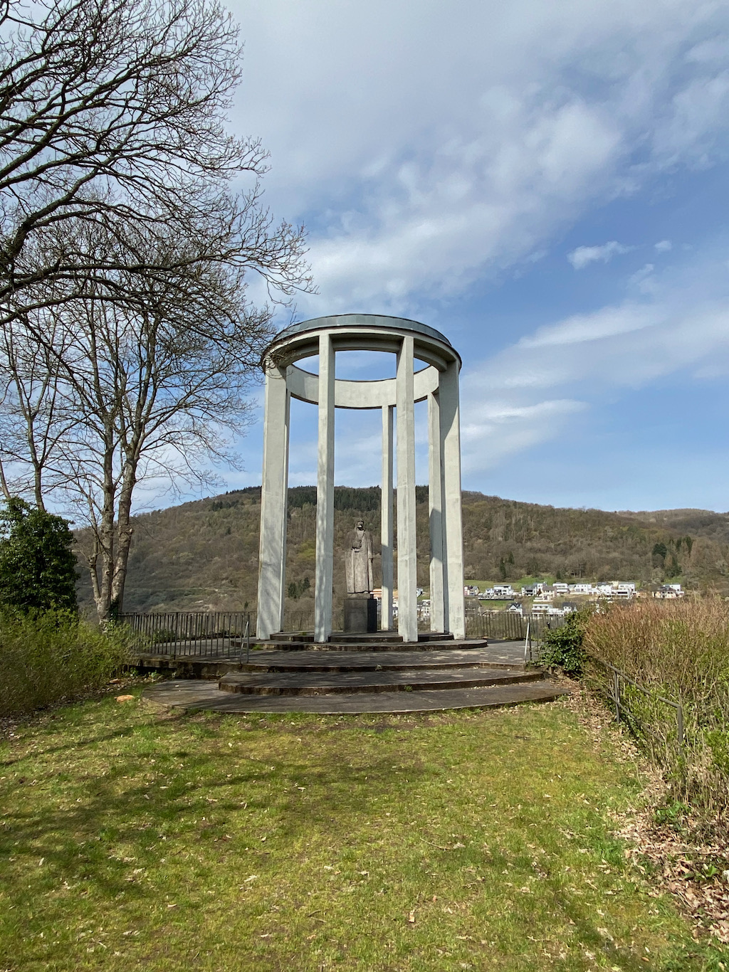 Erneut steigt der Lahnwanderweg in den Hang hinein und ein wenig aus der Puste erreichen wir das Denkmal des Freiherrn von Stein, einem Sohn der Stadt Nassau. Von hieraus führt ein Weg knapp 700 m zur Burg Nassau. Da wegen Corona alles geschlossen ist ersparen wir uns den Aufstieg und ziehen weiter der Wegmarkierung folgend.