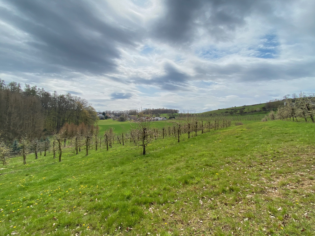 Wir laufen durch das idyllische Mühlbachtal und durchschreiten eine sattgrüne Talaue. Ein Schild warnt vor Wildschweinen, sehen tun wir aber keine. Kurze Zeit später, wie soll es auch anders sein, geht es erneut steil bergan.