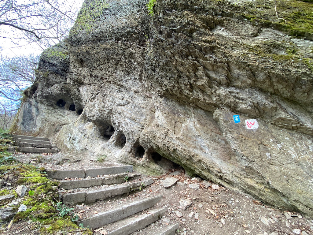 Im Fels neben uns befinden sich plötzlich überall kleine ausgewaschene Löcher. Die sogenannten Heinzelmannshöhlen. Hier wohnten der Sage nach kleine Heinzelmännchen, die den Bad Emsern in der Nacht die Arbeit abnahmen.