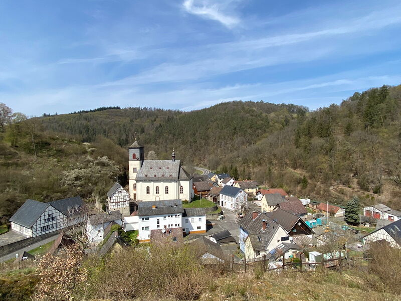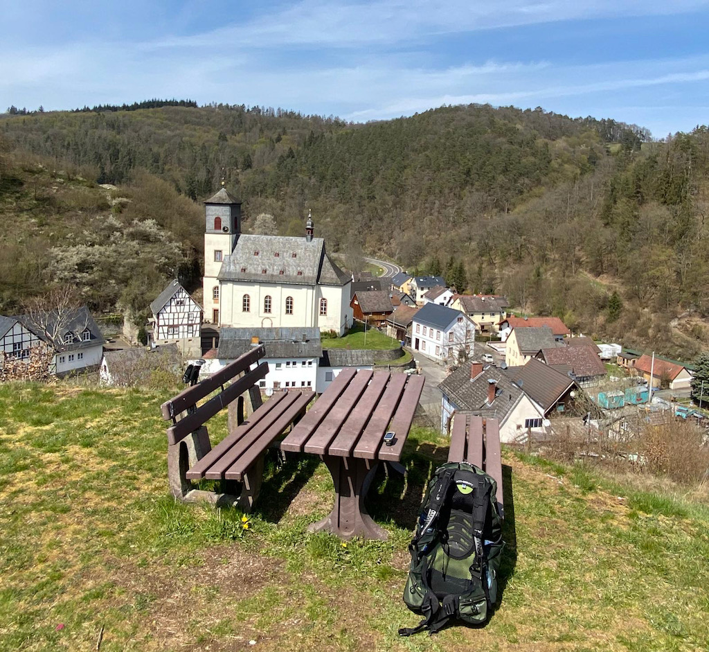 Keinen Kilometer später sind wir den Ameisen dafür dankbar, dass sie uns verjagt haben, denn wir erreichen einen wunderschönen Picknickplatz auf einem kleinen Hügel oberhalb des Ortes Niedergladbach. Bei einer Tasse Kaffee und kleinen Snacks blicken wir auf die Katholische Pfarrkirche St. Aegidius und die drumherum drapierten Fachwerkhäuser. Die Wälder des Taunus ziehen sich dabei wie ein Schutzwall um das kleine Dorf.
