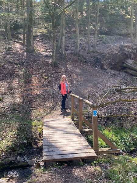 Nach Kaffee, Tee und leckeren Brötchen geht es gestärkt weiter. Wir überqueren eine kleine Brücke und steigen nun stetig bergauf in das Naturschutzgebiet Gladbachtal.