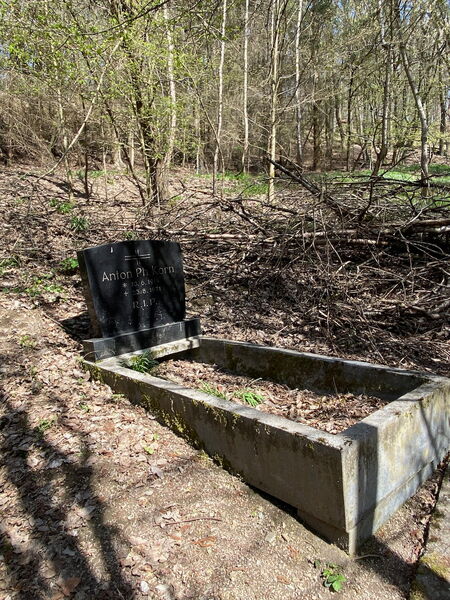 Kurz bevor wir den Ort Obergladbach erreichen, passieren wir einen kleinen Friedhof und bleiben kurz an einem alten Grabstein stehen. Es ist der einzige auf diesem kleinen alten Friedhof mitten im Wald.