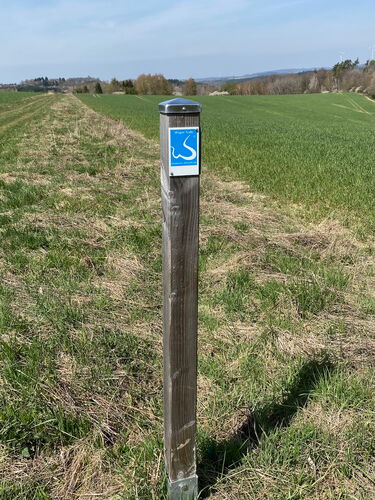 Nachdem wir die ersten Höhenmeter hinter uns gelassen haben, geht es auf einem breiten Forstweg der Ebene entlang bis zum Parkplatz Roter Kopf. Hier treffen wir auf die Wegmarkierung des Hessenweges. Einem 319 km langen Fernwanderweg von Eltville am Rhein bis zum Diemelsee.