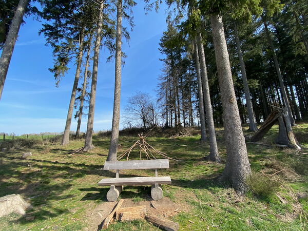 Wir laufen ein Stück entlang der Talstraße durch den Ort und wandern am namensgebenden kleinen Bach vorbei wieder in den Wald hinein. So langsam wird es Zeit für ein kleines Mittagspäuschen. Einen geeigneten Platz zu finden fällt nicht schwer, denn gefühlt alle 500 m läuft man an neu aufgestellten Wanderbänken vorbei.