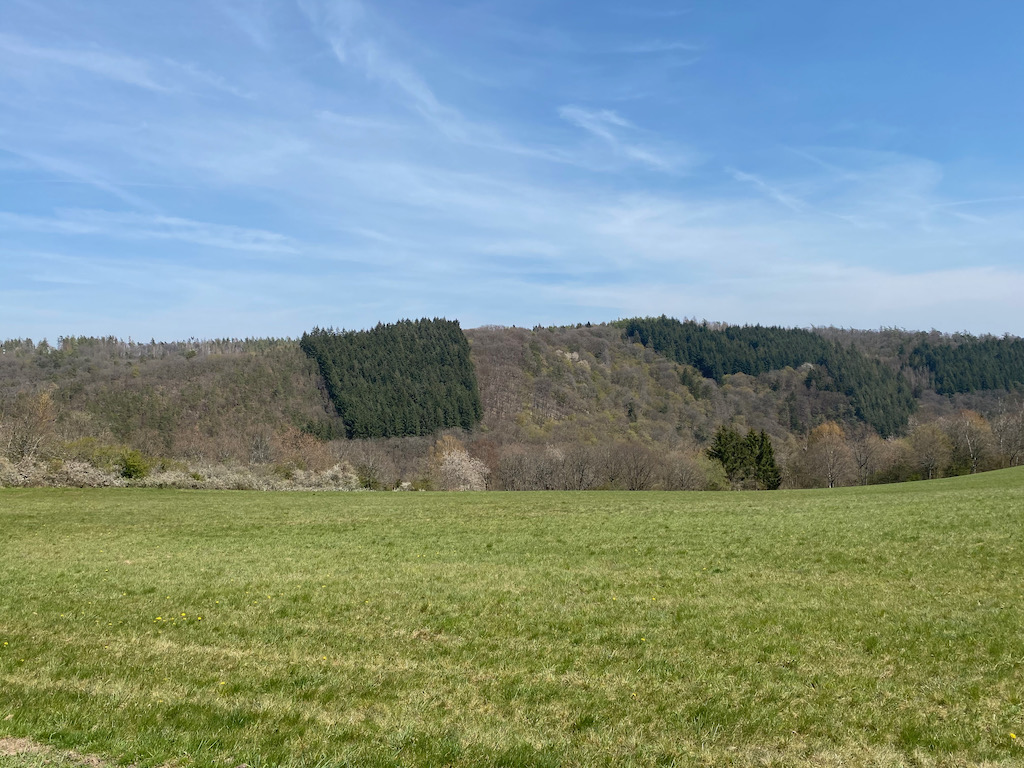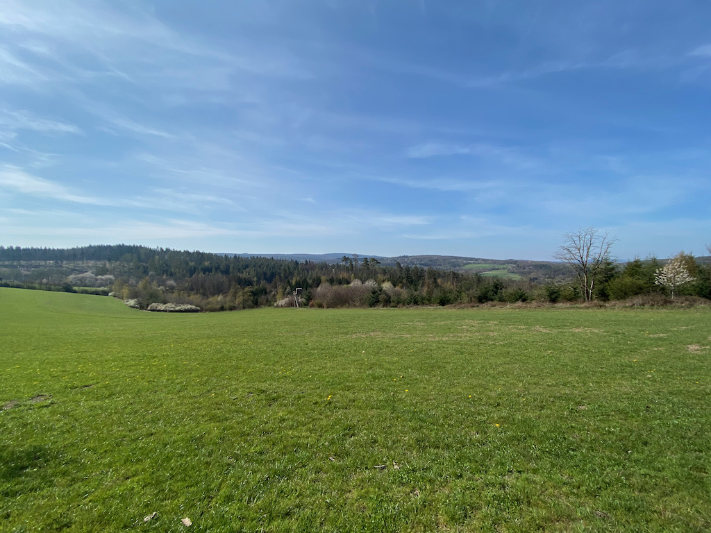 Schon bald erreichen wir den Roterberg auf 460 m Höhe und staunen über die fantastische Aussicht auf die Hügel des Taunus und das satte Grün der Almen.