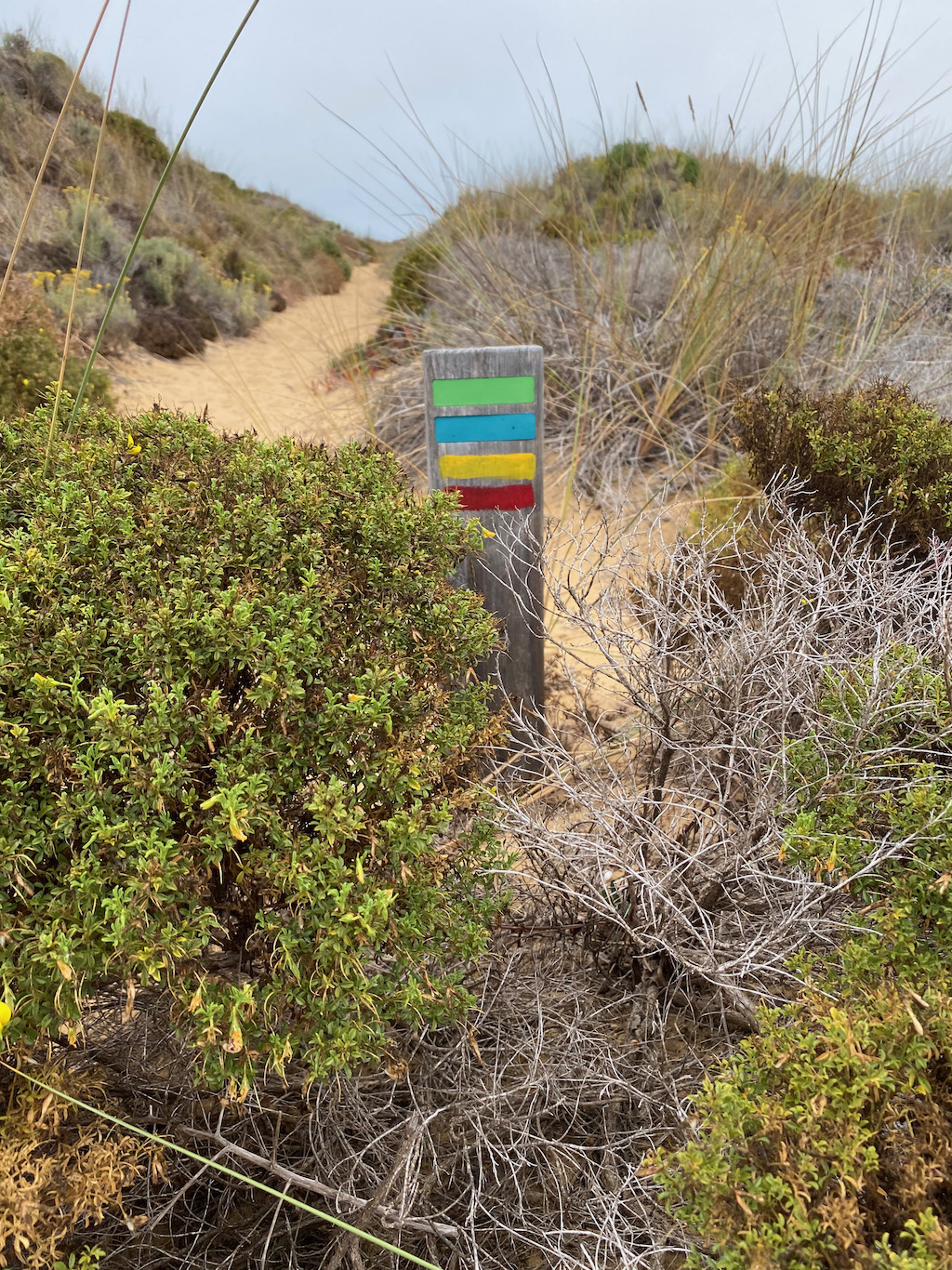 Der Weg führte mich auf sandigen Pfaden durch ein einzigartige Dünenlandschaft bis hin zum Ribeira (Flussufer) da Bordeira. Dem Flussufer folgend ging es entlang eines felsigen Steilhanges mit fantastischem Blick auf den riesigen, aber fast menschenleeren Sandstrand von Bordeira. Zum Baden etwas zu kühl, aber für mich persönlich bestes Wanderwetter. Als sich dann nach weiteren 2 Kilometern auch die Sonne durch das grau des Himmels hindurchkämpfte, war es nahezu perfekt.